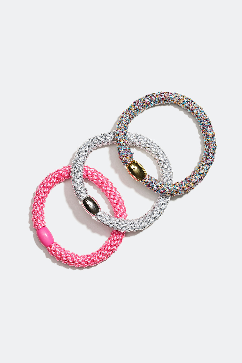 3-pack kraftiga hårsnoddar i en rosa, silver och guld mix av färger med pärldetalj i matchande färg. Dessa tofsar är hopflätade av små resårsnoddar, vilket gör dem extra elastiska och mycket skonsamma mot håret. När du inte använder dem i håret så är dem fina att bara ha runt armleden.