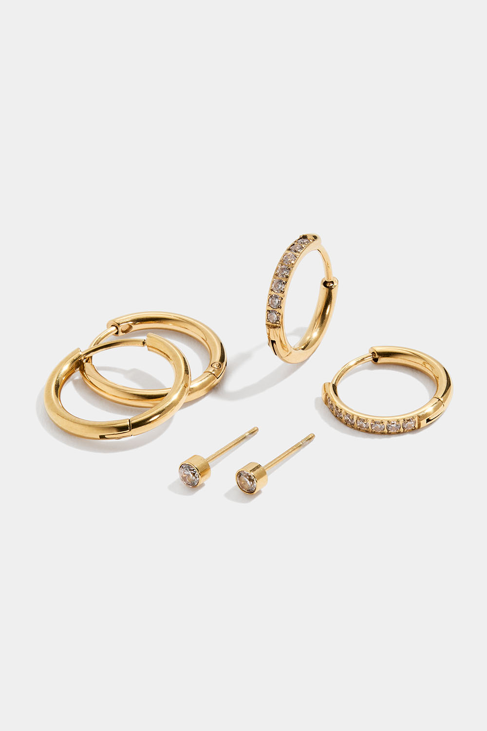 "Två par hoops i olika storlek där det ena har en rad av Cubic Zirkonia stenar, och ett par ministuds med en Cubic Zirconia sten. Alla örhängena är gjorda i högpolerat rostfritt stål som är PVD-pläterat med 18K guld.