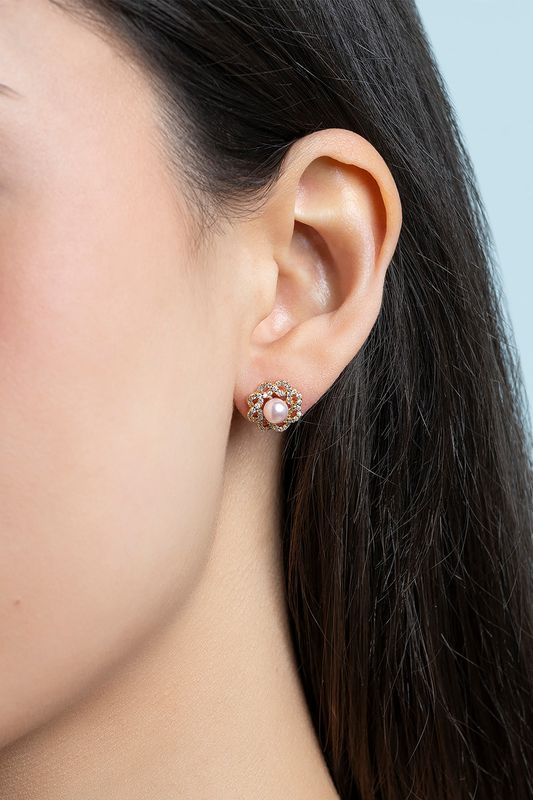 Våra Fleur-örhängen har en strålande rosalinfärgad pärla i mitten, inramad av fina bladdetaljer dekorerade med små klara stenar. En tidlös och elegant design, perfekt för både vardag och fest.