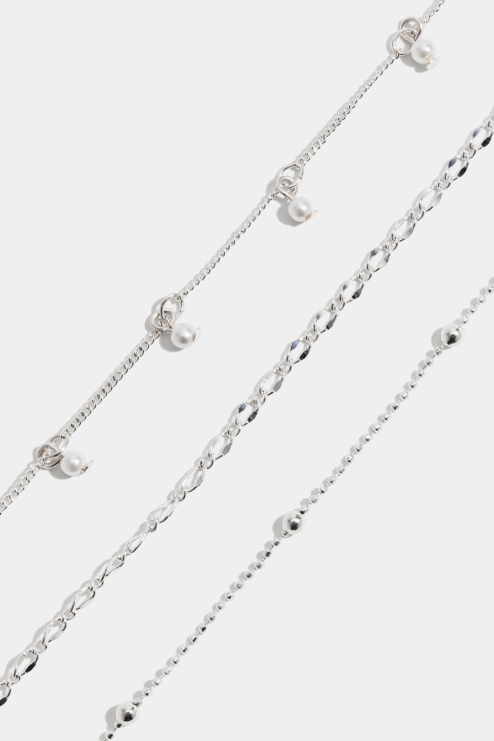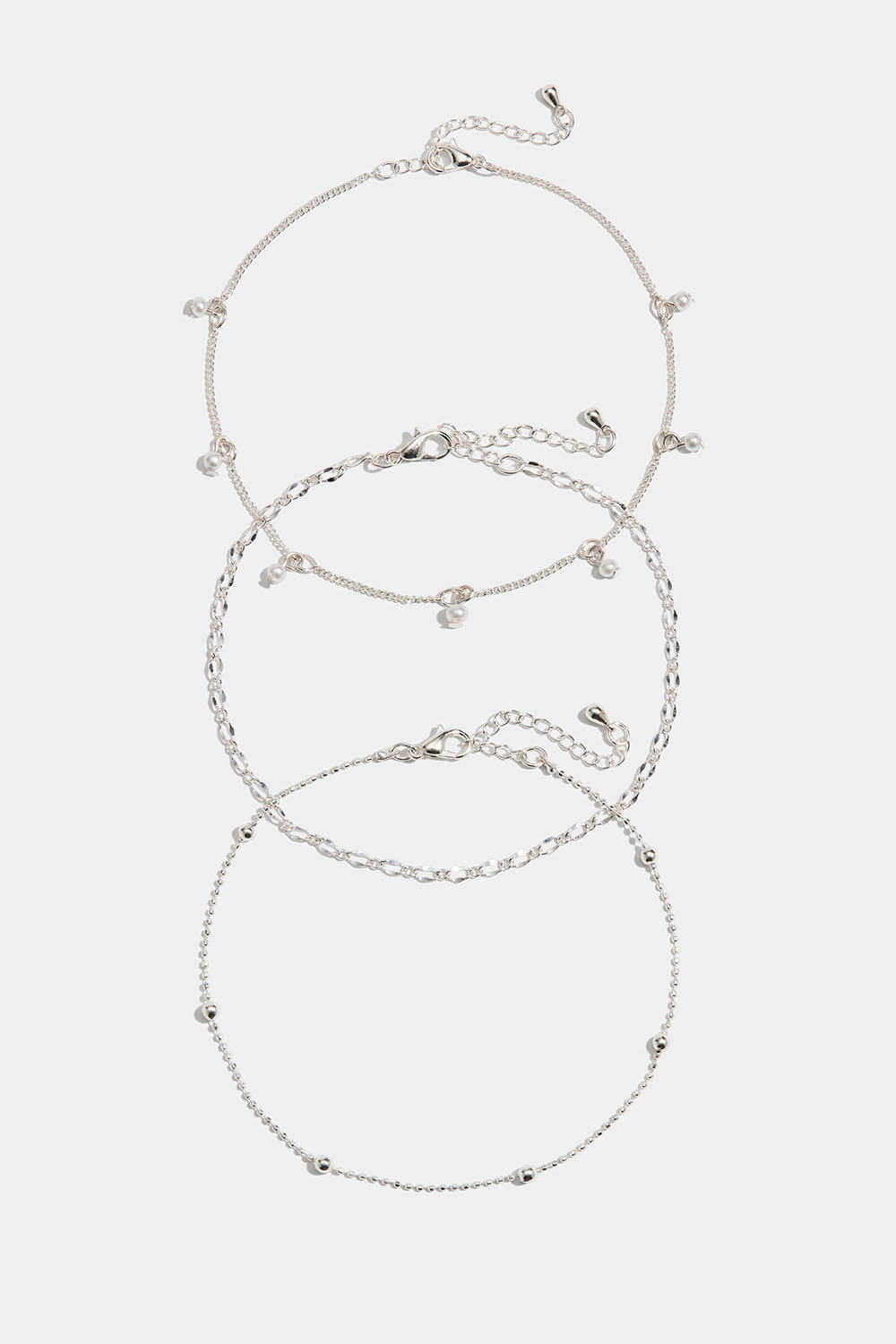 3-pack med fotlänkar. En med vita pärlor, den andra med metallkulor och den tredje med hamrad design.