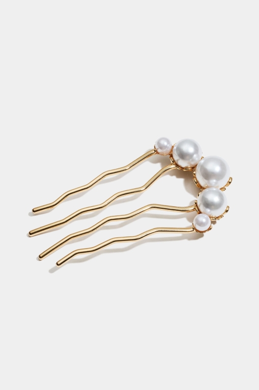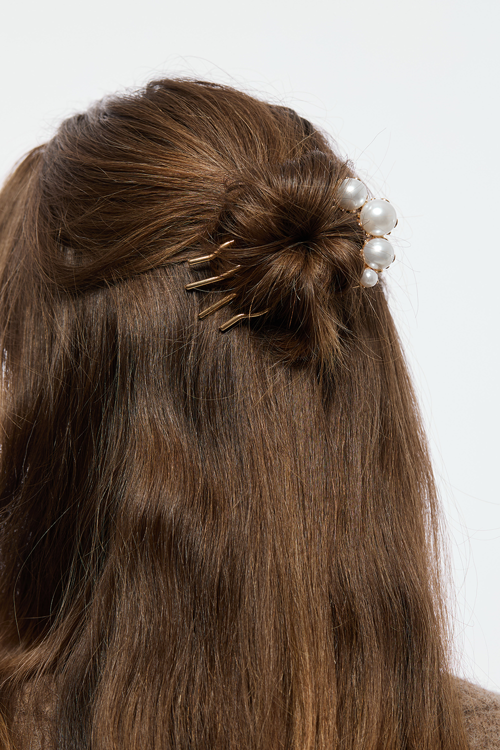 Franskhårnål med fyra piggar, dekorerad med vita pärlor i olika storlek.