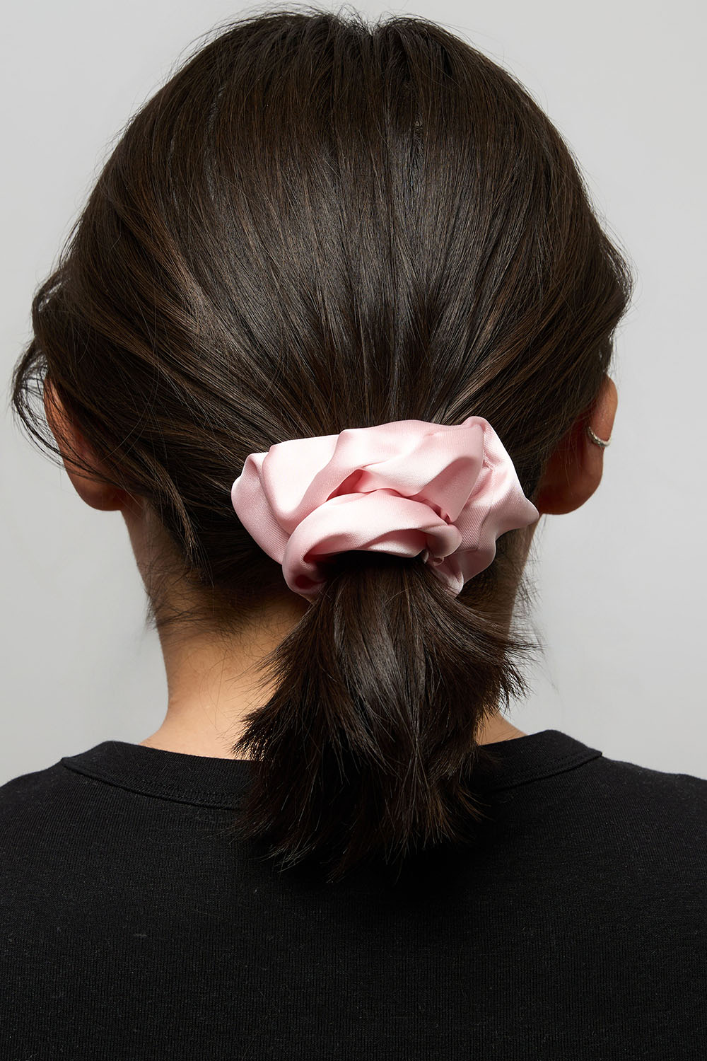 Rosa liten scrunchie i glansig sidenimitation. Klassisk håraccessoar som är skonsam mot håret.