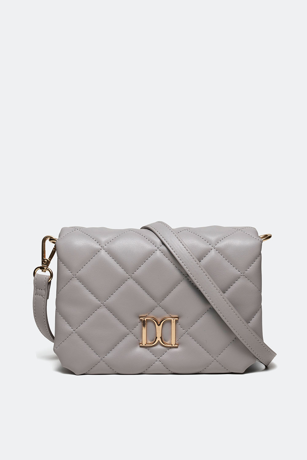 Liten grå quiltad väska med gyllene Don Donna spänne och axelrem. Väskan kommer med ett stort och ett mindre fack och axelremmen är justerbar och avtagbar.