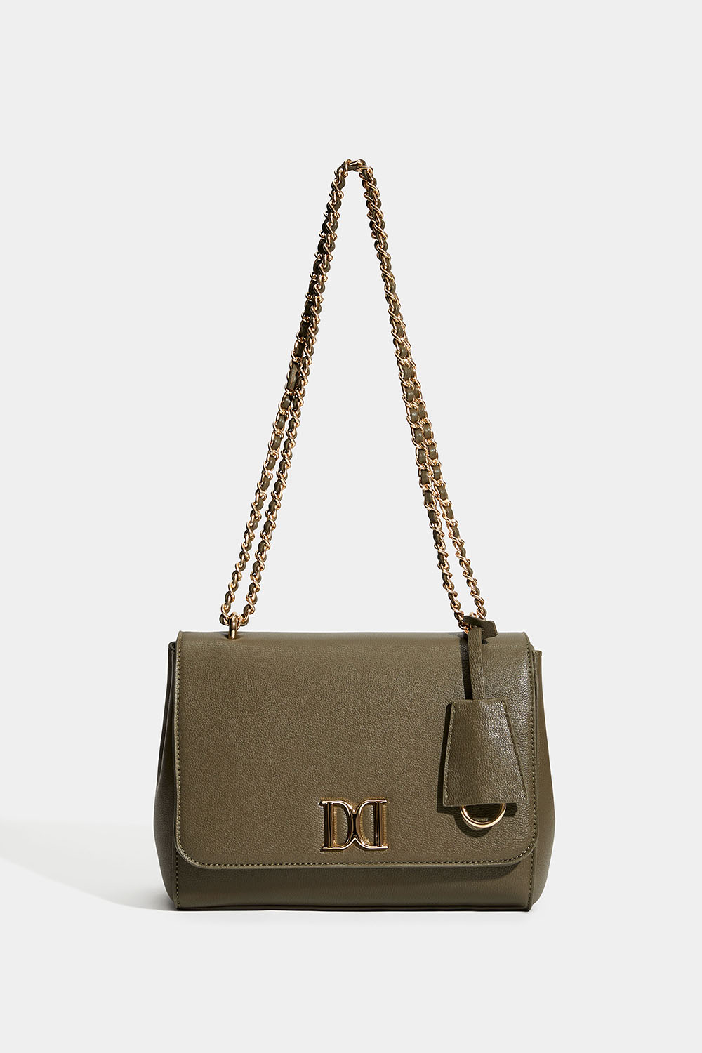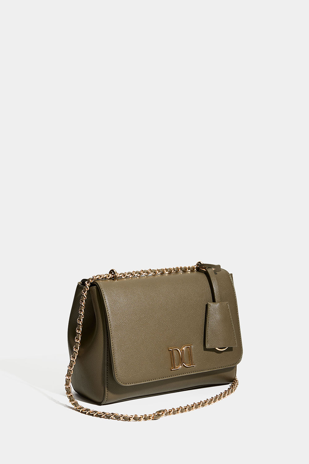 Grön väska i läderimitation från Don Donna med guldfärgad logga och axelrem med kedja. Man kan antingen bära kedjan dubbelt för kortare axelrem, samt som längre och då kan väskan även bäras crossbody. Väskan stängs med en magnetknapp och har ett litet innerfack som stängs med dragkedja. Det medföljer även en avtagbar nyckelring.