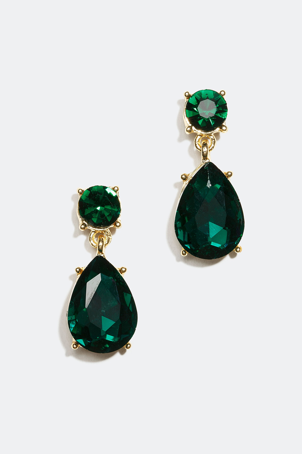 Örhängen i guldfärgat metall med runt fäste och droppformat hänge med skimrande gröna glasstenar. Stilrena och tidlösa örhängen som passar perfekt för flera olika typer av fester och tillställningar.