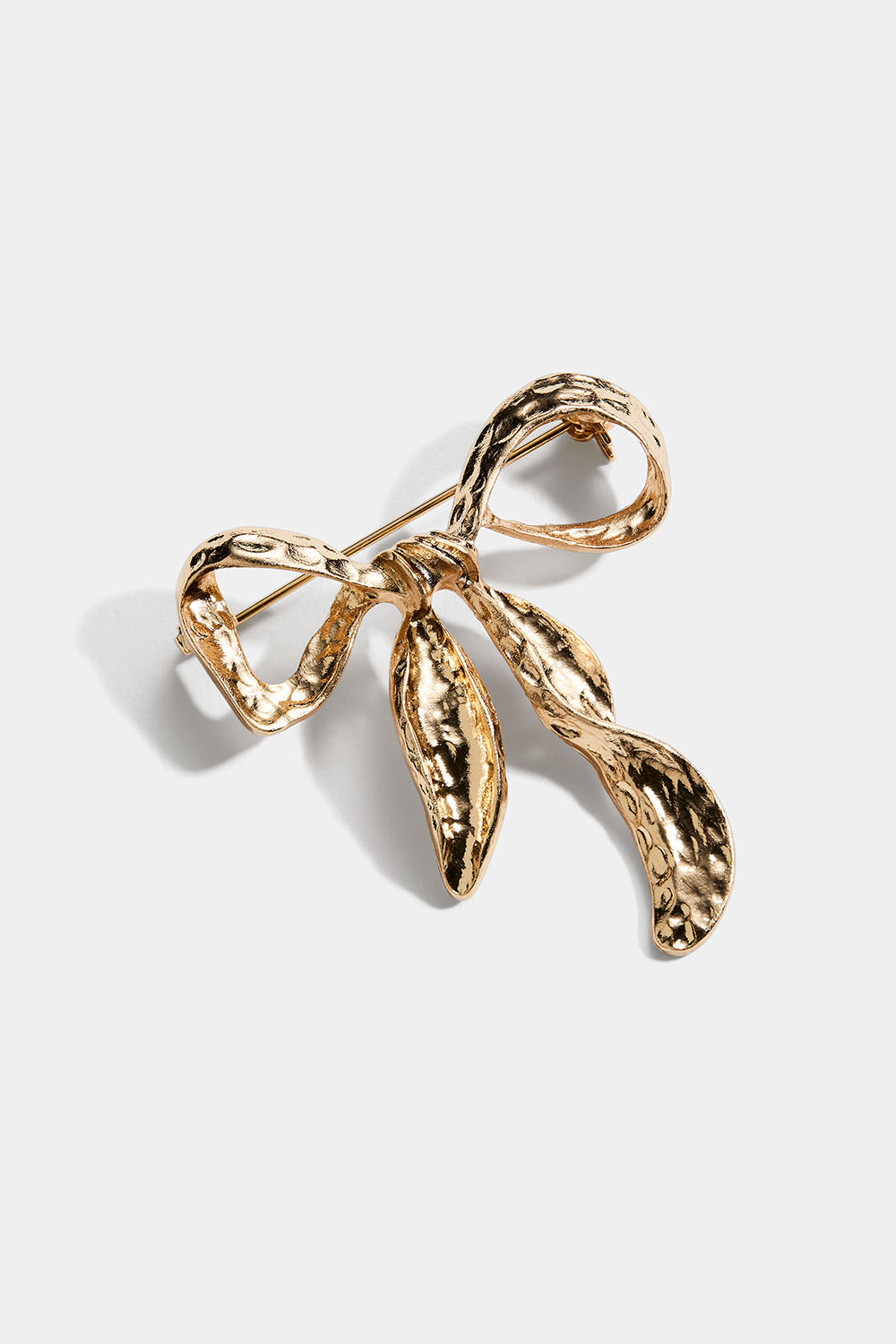 Brosch i guldfärgad metall med en rosett i hamrad textur. Fästs med en klassik broschnål.