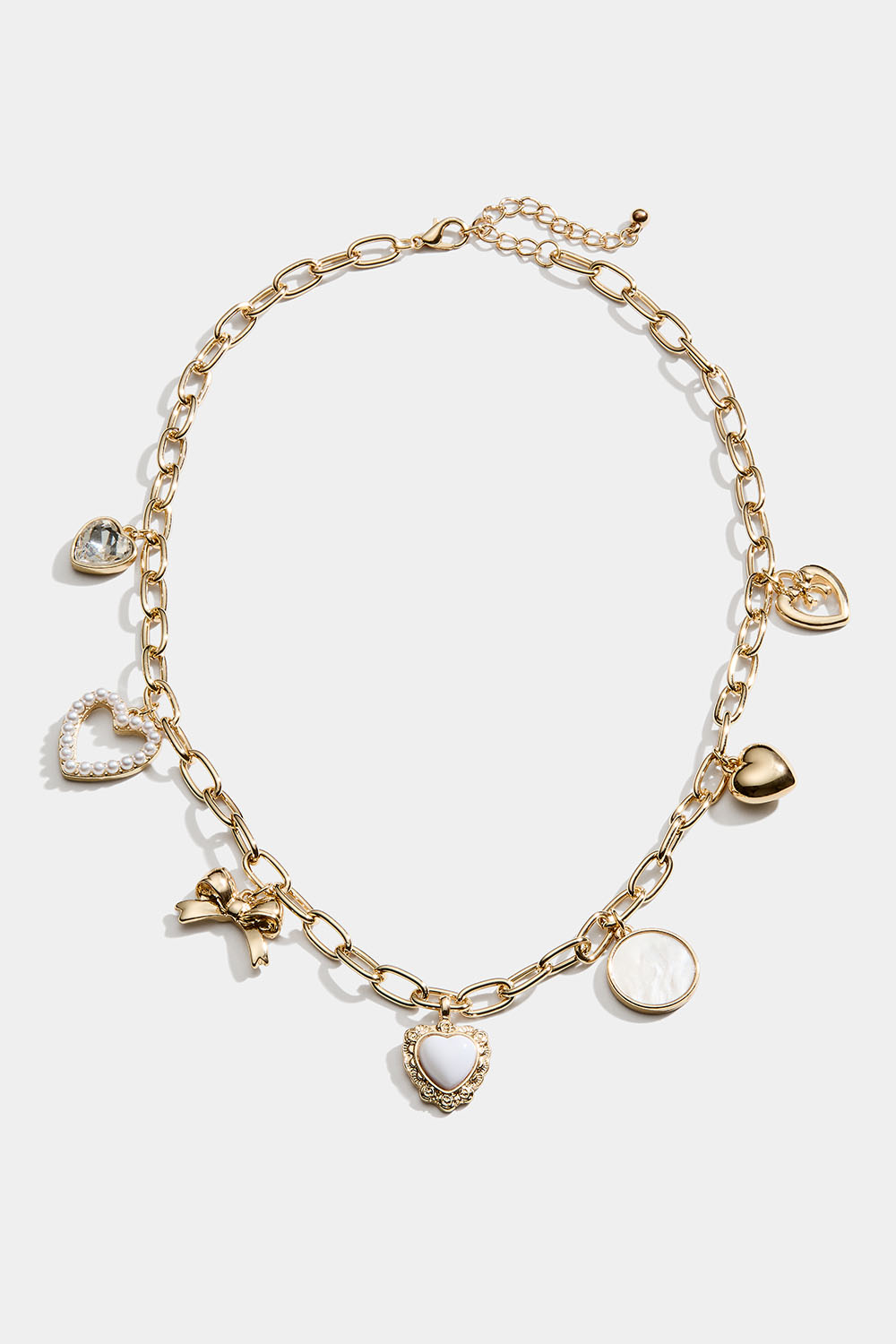 Guldfärgat kedjehalsband i metall, med ovala länkar och 7 olika berlocker i form av hjärtan och rosetter.