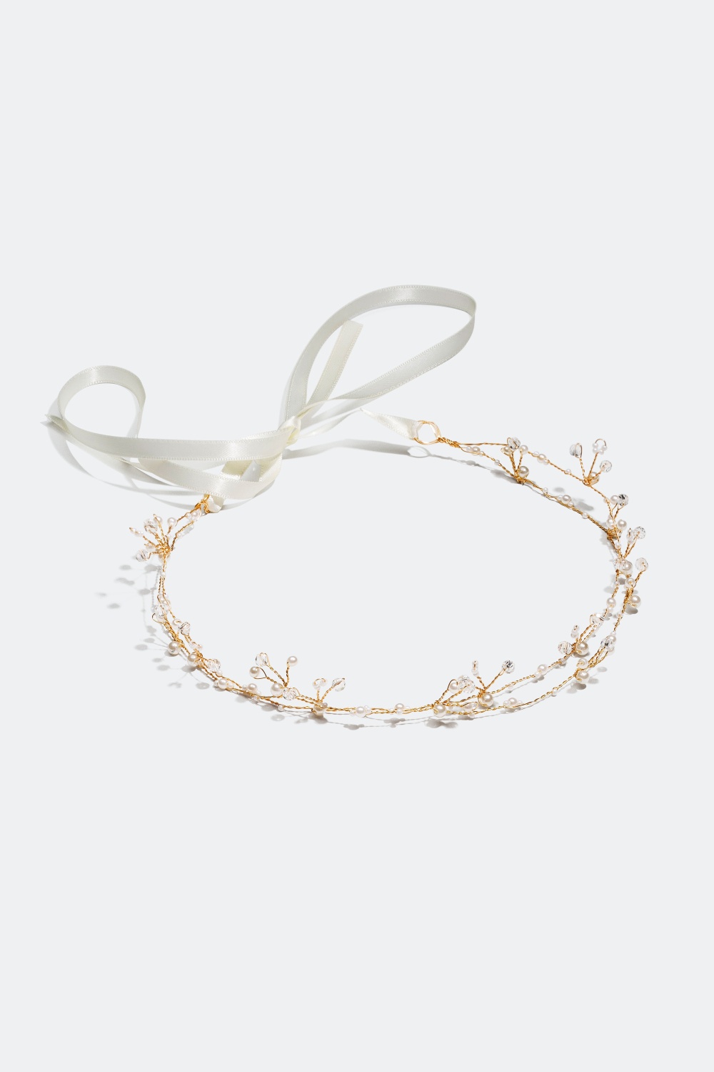 Vacker, tvinnad hårdekoration. Guldfärgade metalltrådar som dekorerats med stenar i glas och plastpärlor, som knyts fint ihop med hjälp av vita satinband.