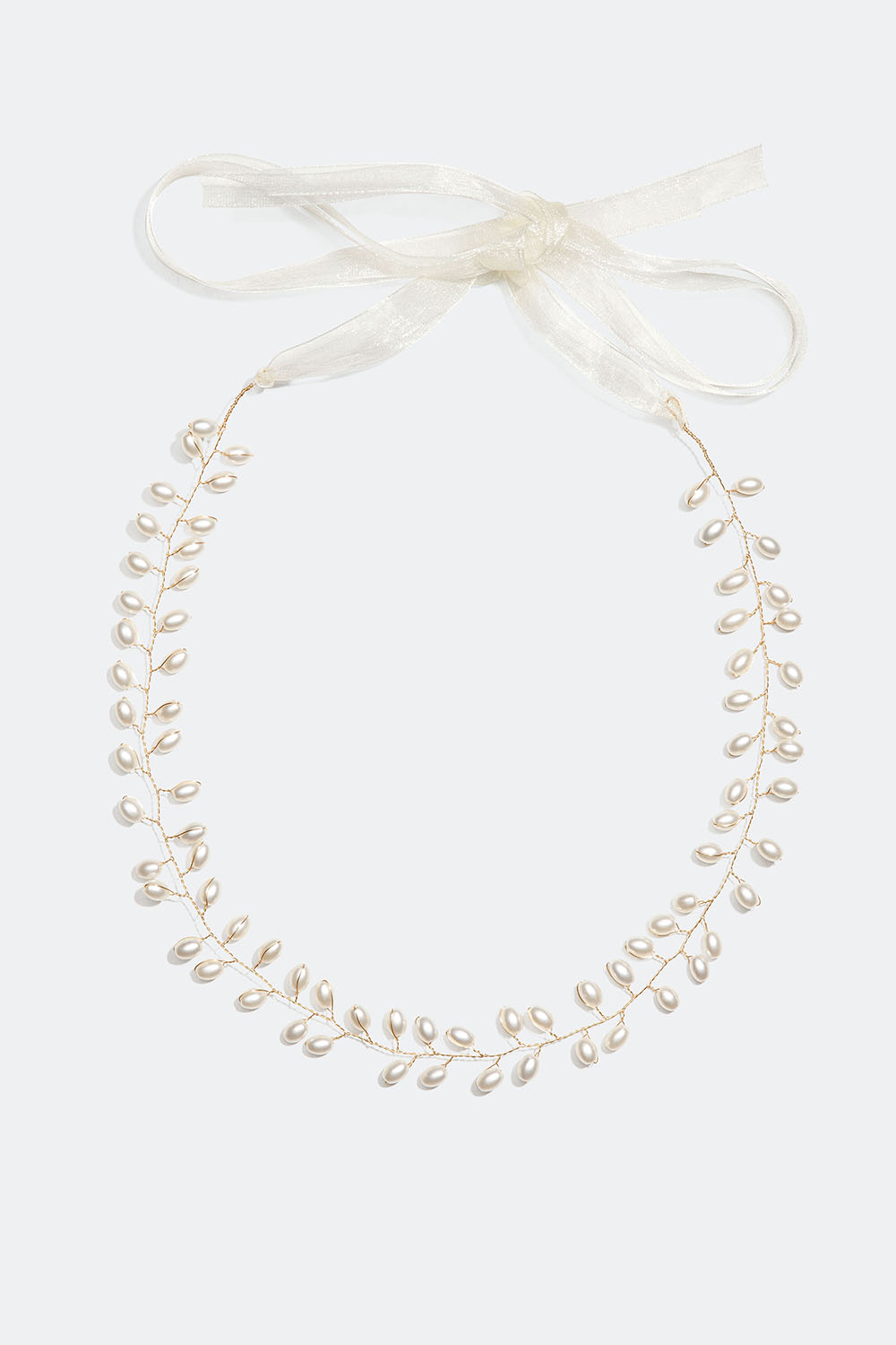 Vacker hårdekoration med tvinnad trådar i guldfärgad metall som dekorerats med vita pärlor. En perfekt håraccessoar till fest och bröllop som knyts fint ihop med hjälp av vita band.