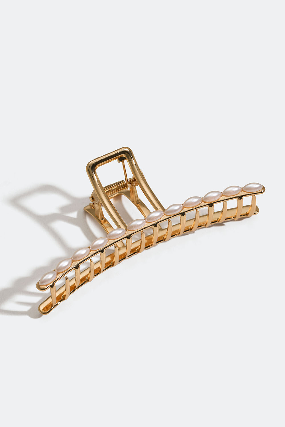 Avlång smal hårklämma i guldfärgad metall som är dekorerad med vita pärlor.