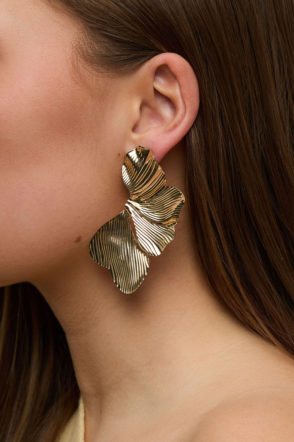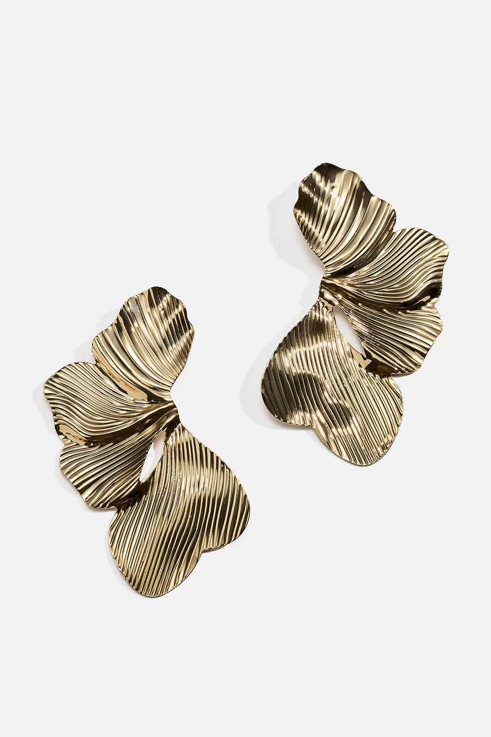 Stora blombladsformade örhängen i guldfärgad metall med räfflad design.