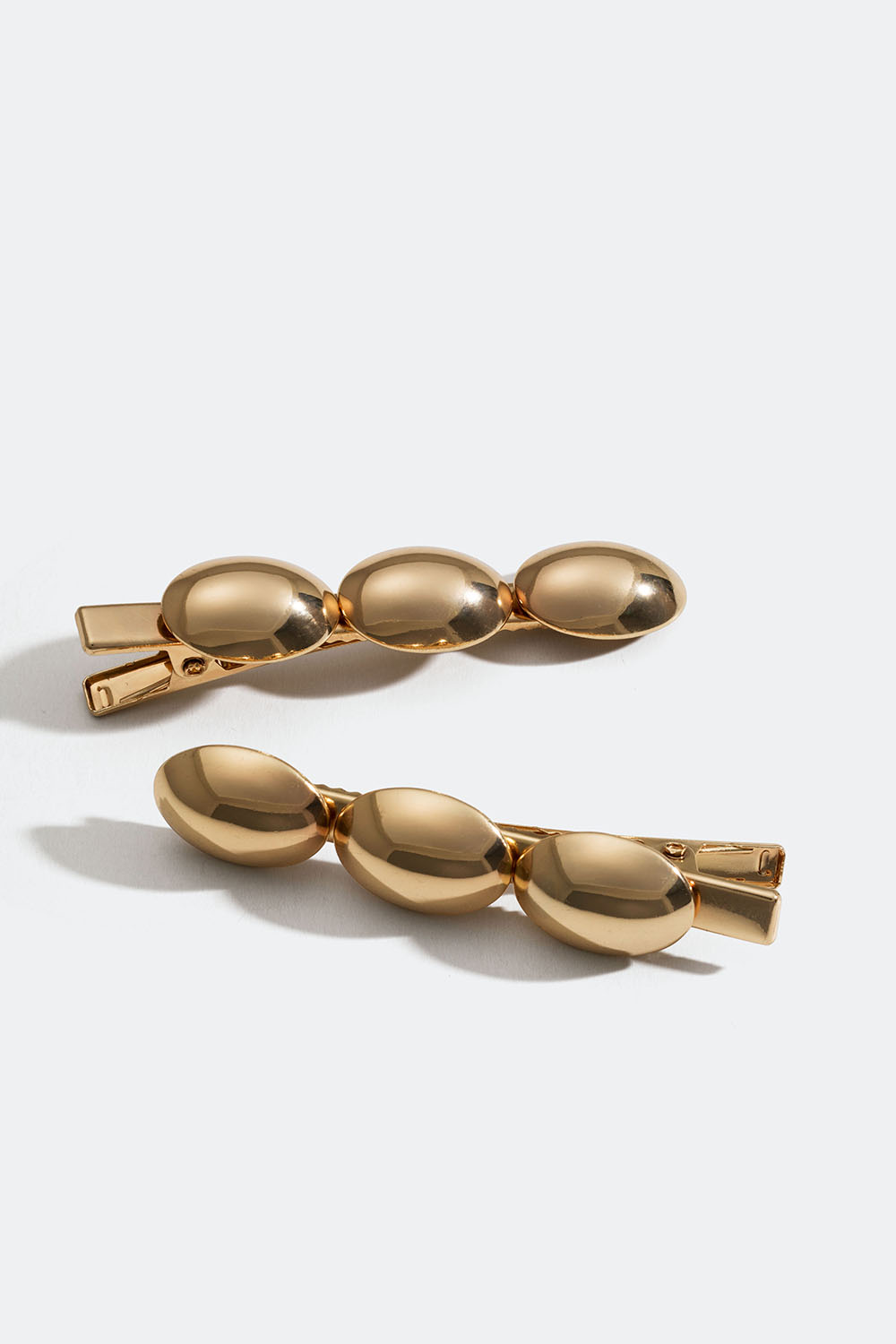 2-pack hårspännen med näbbklämma i guldfärgad metall med ovala plattor.