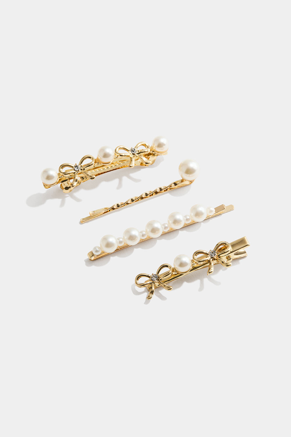Guldfärgade hårspännen med rosetter och pärlor, 4-pack i gruppen Håraccessoarer / Spännen & klämmor / Hårspännen hos Glitter (335001782000)