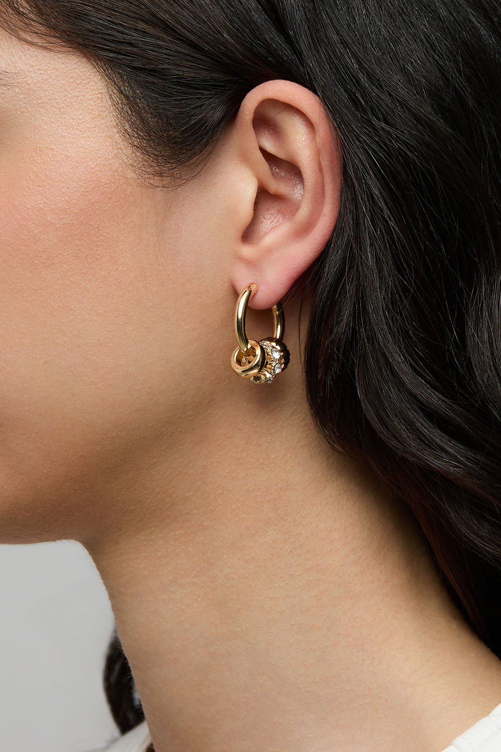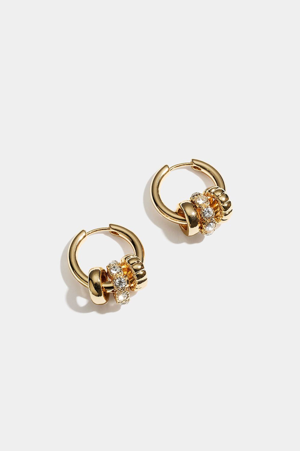 Hoops i guldfärgad metall med tre runda dekorativa berlocker. Örhängena kommer med en slät, en ribbad och en skimrande med glasstenar.