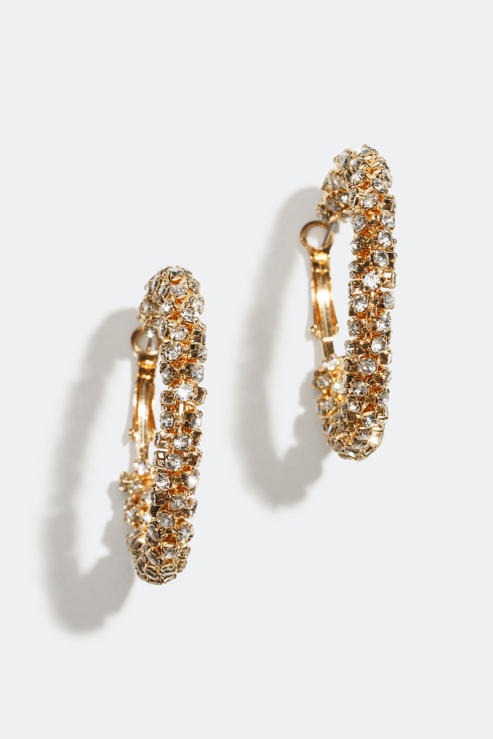 Hoops i guldfärgad metall som är dekorerade med skimrande glasstenar i en tvinnad design. Ett par glänsande örhängen med strass som är perfekta att använda till fest och andra get-togethers.