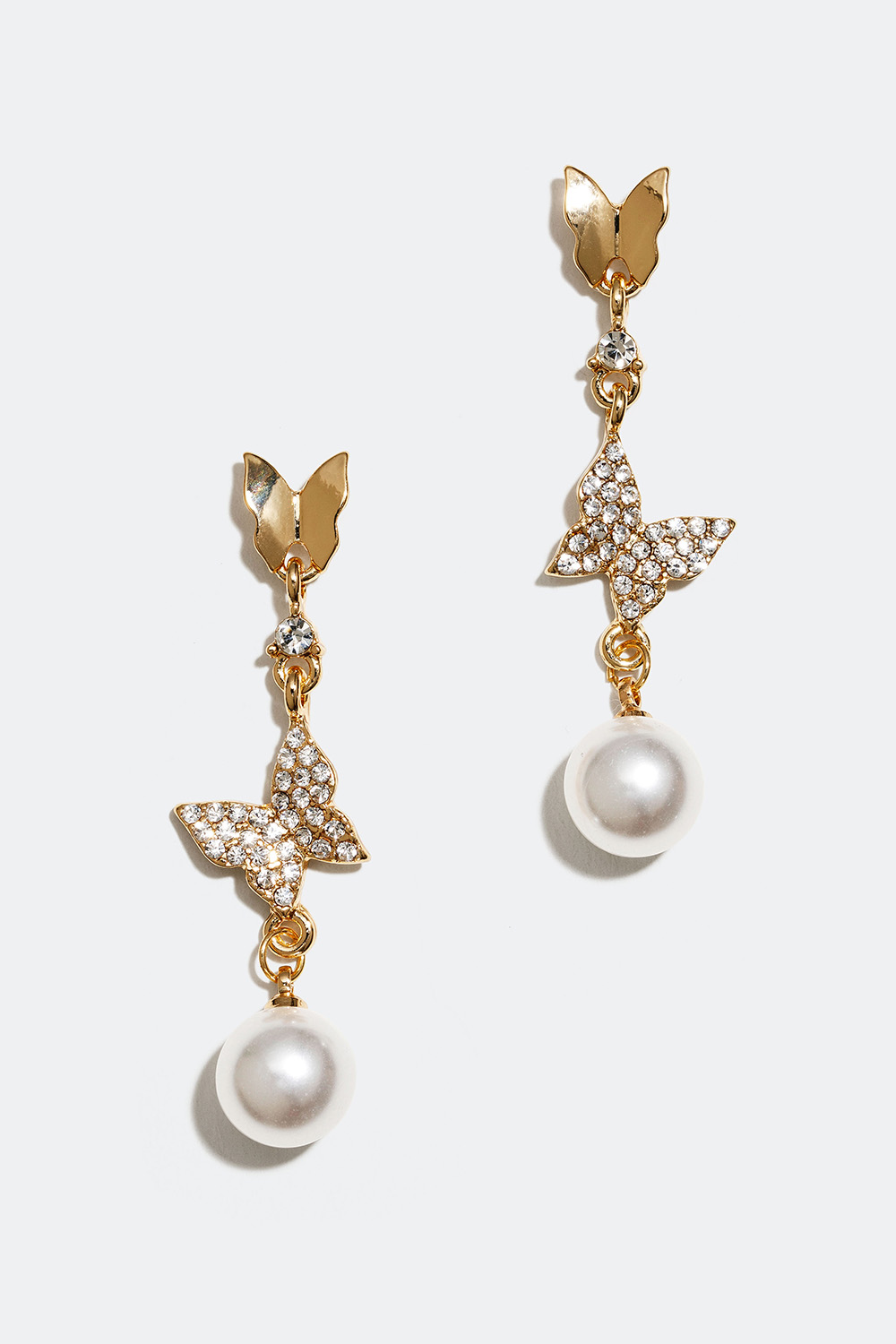 Guldfärgade örhängen med hängande fjärilar och rund pärla, varav den ena fjärilen är utsmyckad med glasstenar. Ett par dekorativa örhängen med skimrande detalj som passar både till vardags och till fest.