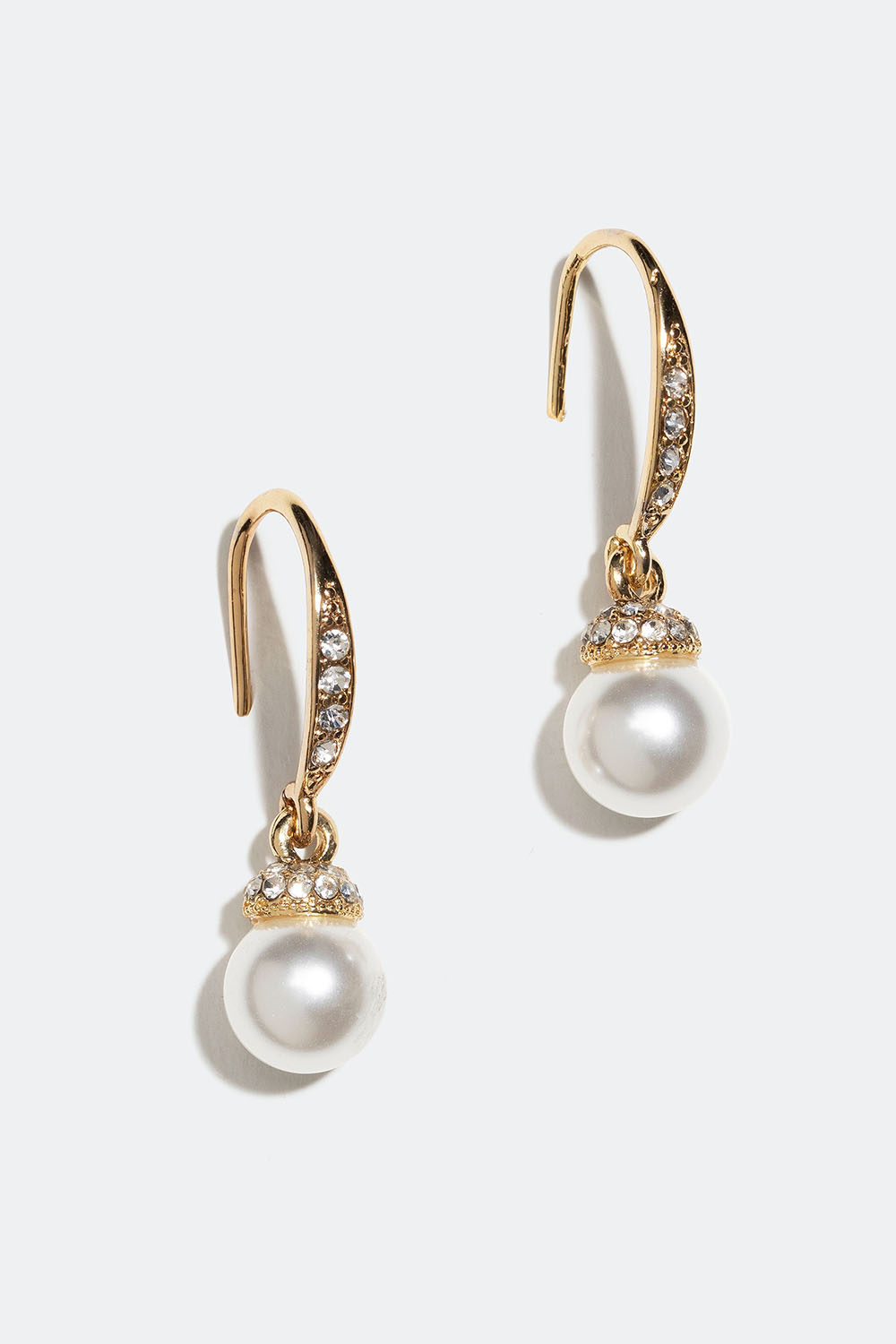 Örhängen i guldfärgad metall som är utsmyckade med skimrande glasstenar och vita glaspärlor.