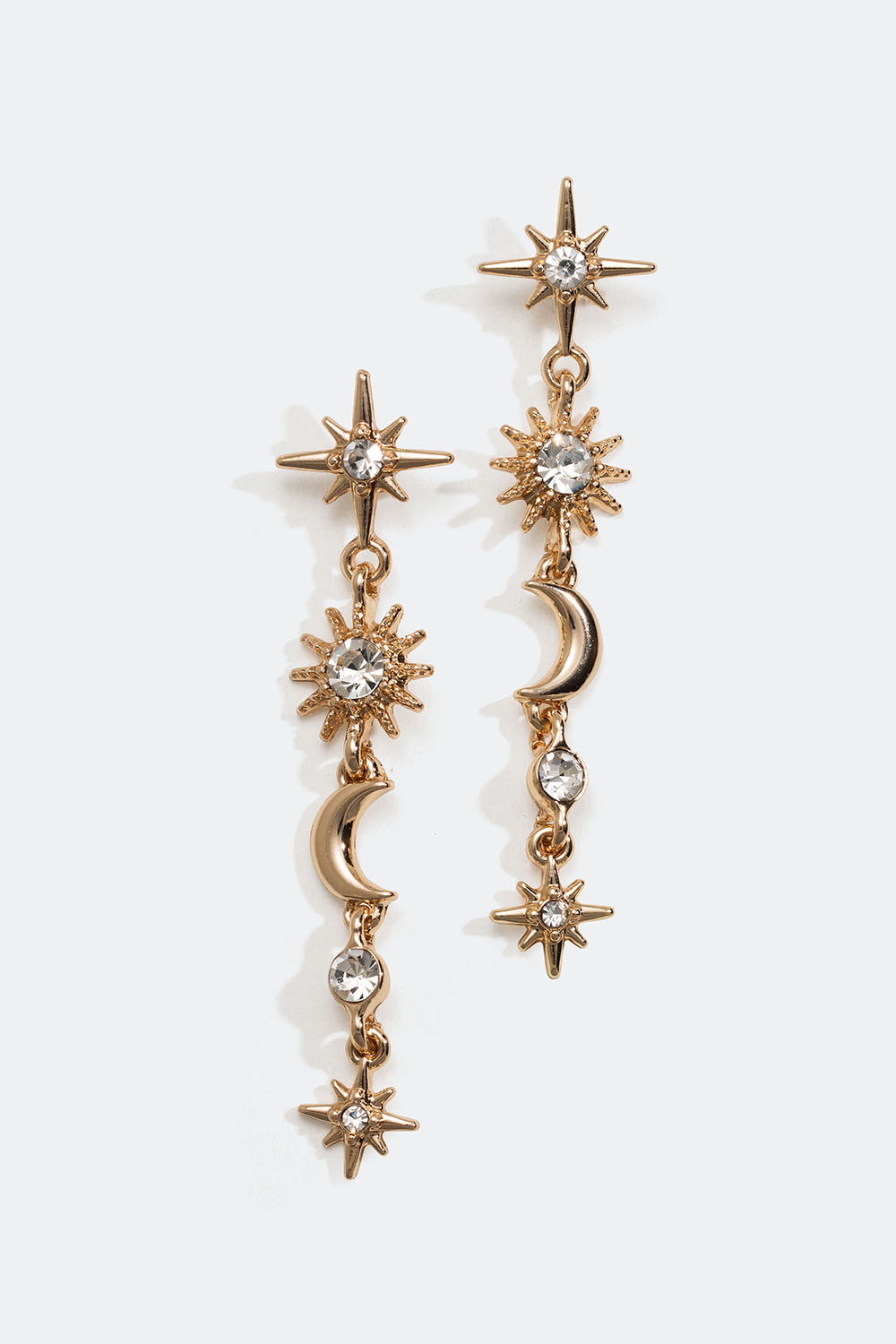 Långa örhängen i guldfärgad metall med hängen av stjärnor, månar och runda glasstenar.