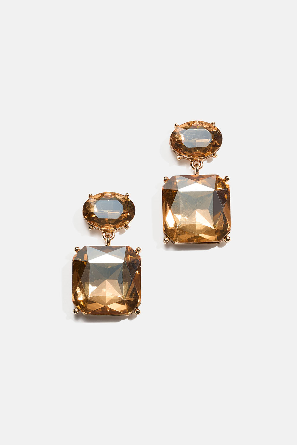 Örhängen i guldfärgad metall med stora ovala och fyrkantiga glasstenar.