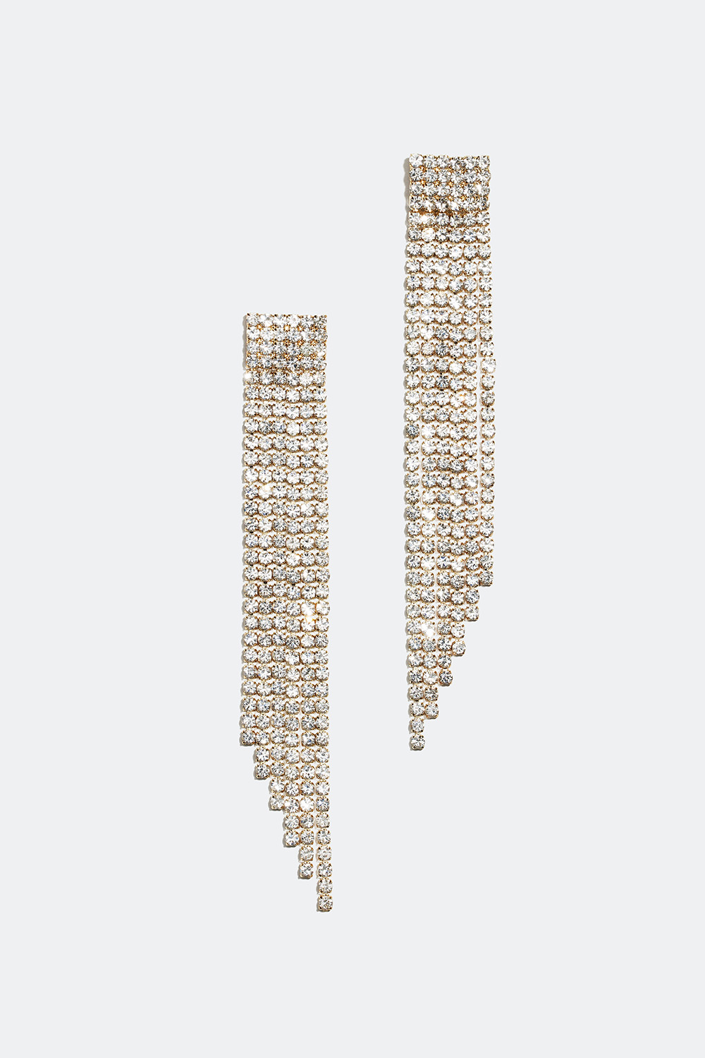 Långa örhängen i guldfärgad metall med sex hängande strasslänkar dekorerade med glasstenar i olika längder. Perfekt strassmycke till festliga tillfällen.