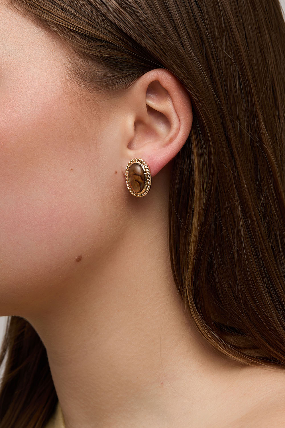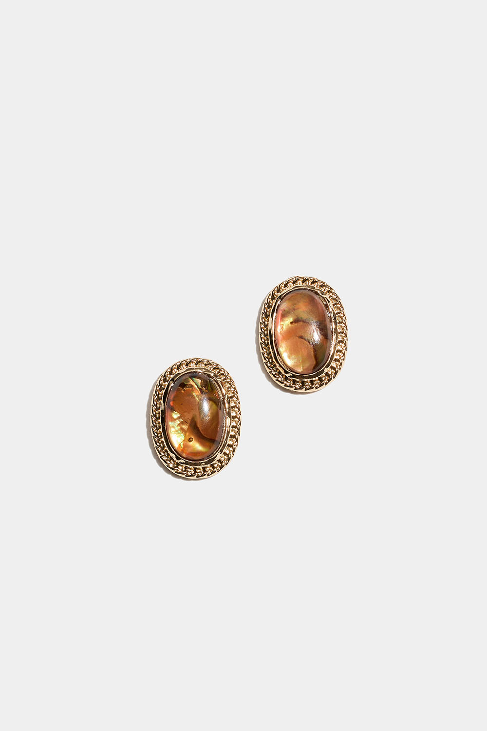 Ovala örhängen i guldfärgad metall med bruna pärlor i resin.