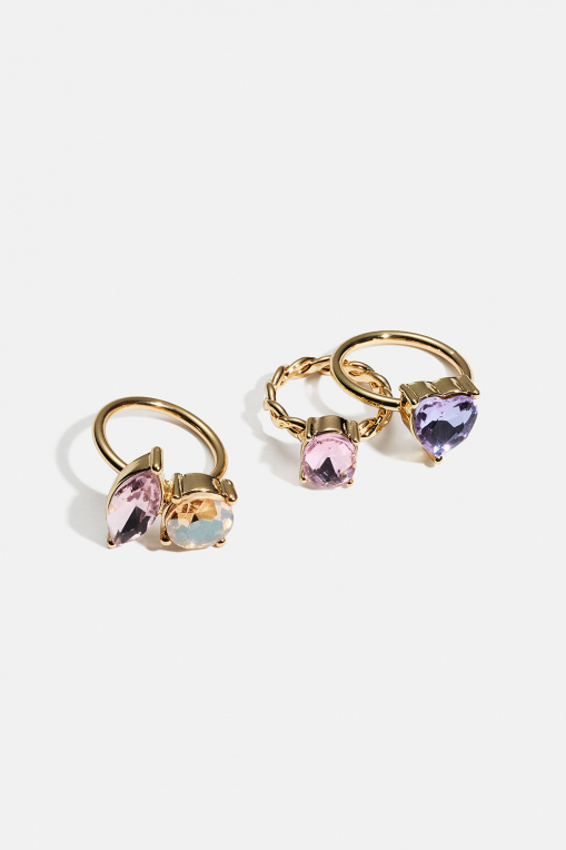 3-pack med ringar i flera storlekar med stora glasstenar i olika design. Paketen kommer med en mix av ringar i guldfärgad metall i storlekarna 16/17/18 eller 18/19/20. En perfekt kombination av ringar med två släta och en tvinnad ring med rund, hjärtformad och ovala glasstenar i olika färger.