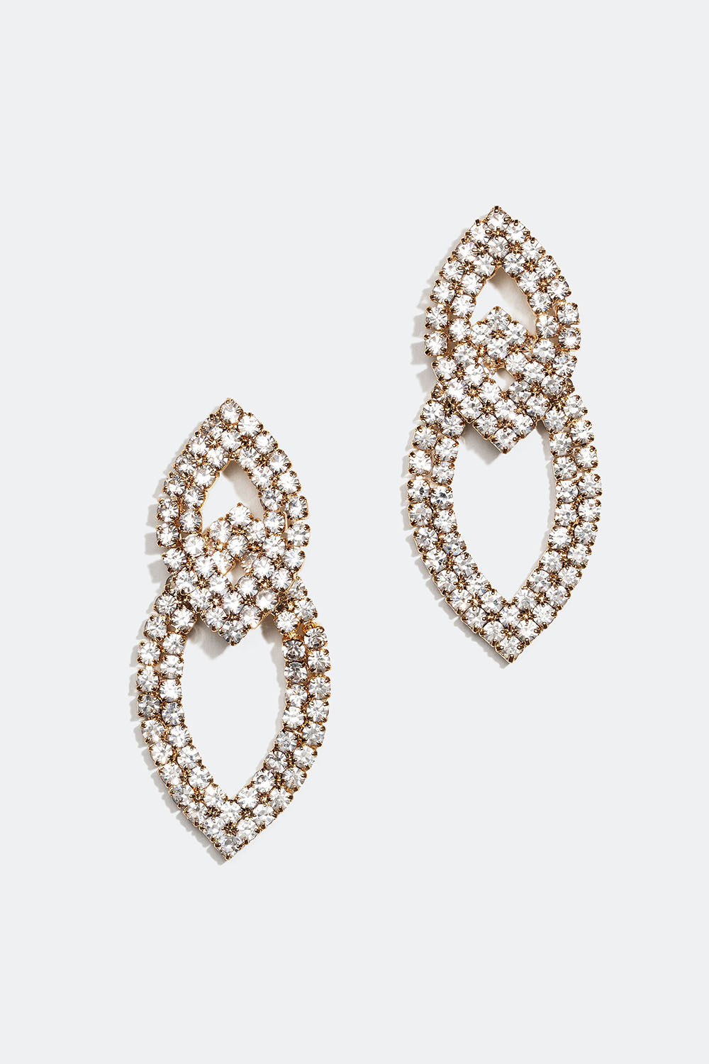 Strassörhängen i guldfärgad metall med två dekorationer. Örhängena är utsmyckade med kristallfärgade glasstenar vilka ger örhängena ett fint skimmer.