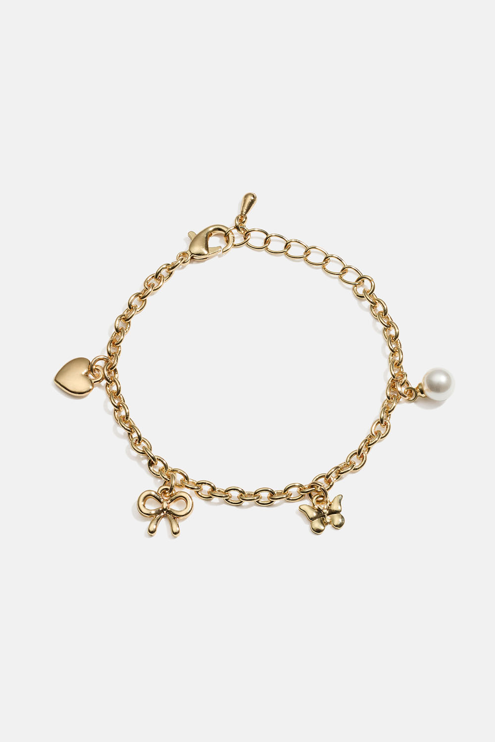 Kedjearmband i guldfärgad metall för barn med hängande berlocker i form av fjäril, hjärta, rosett och vit pärla.