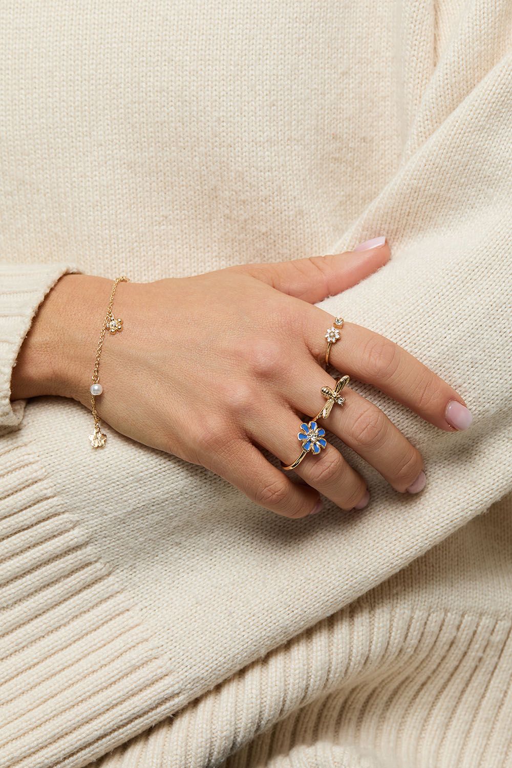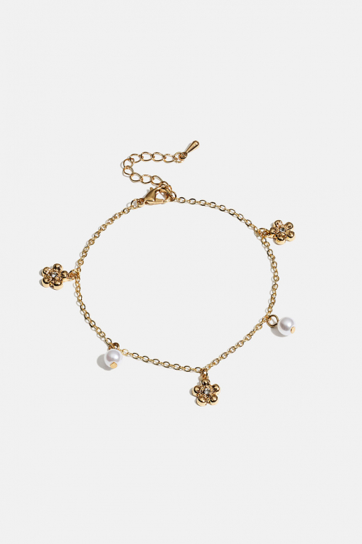Kedjearmband i guldfärgad metall med små hängen av vita pärlor och blommor med skimrig glassten.
