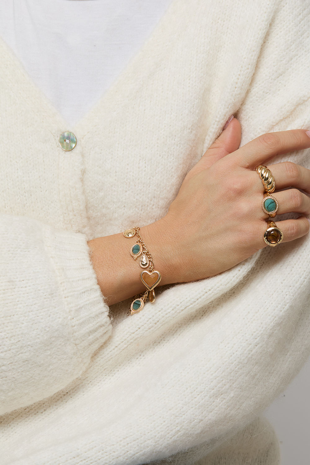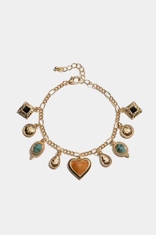 Kedjearmband i guldfärgad metall med flera berlocker i olika färger och designs så som hjärta, runda, droppformade och fyrkantiga.