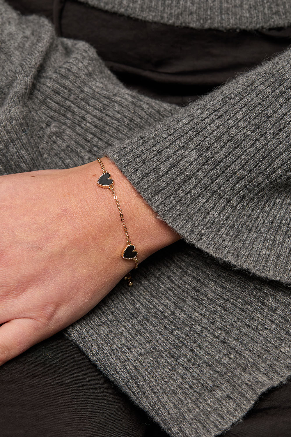 Armband med tunn kedja dekorerad med svarta skimrande hjärtan. Längden är justerbar med hjälp av en gummerad guldpärla.
