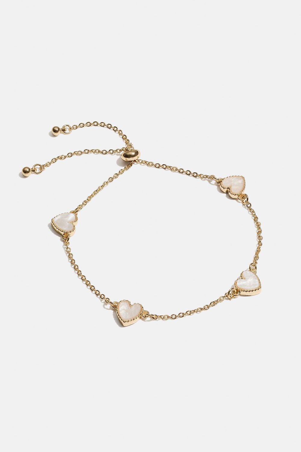 Armband med tunn kedja dekorerad med vita skimrande hjärtan. Längden är justerbar med hjälp av en gummerad guldpärla.