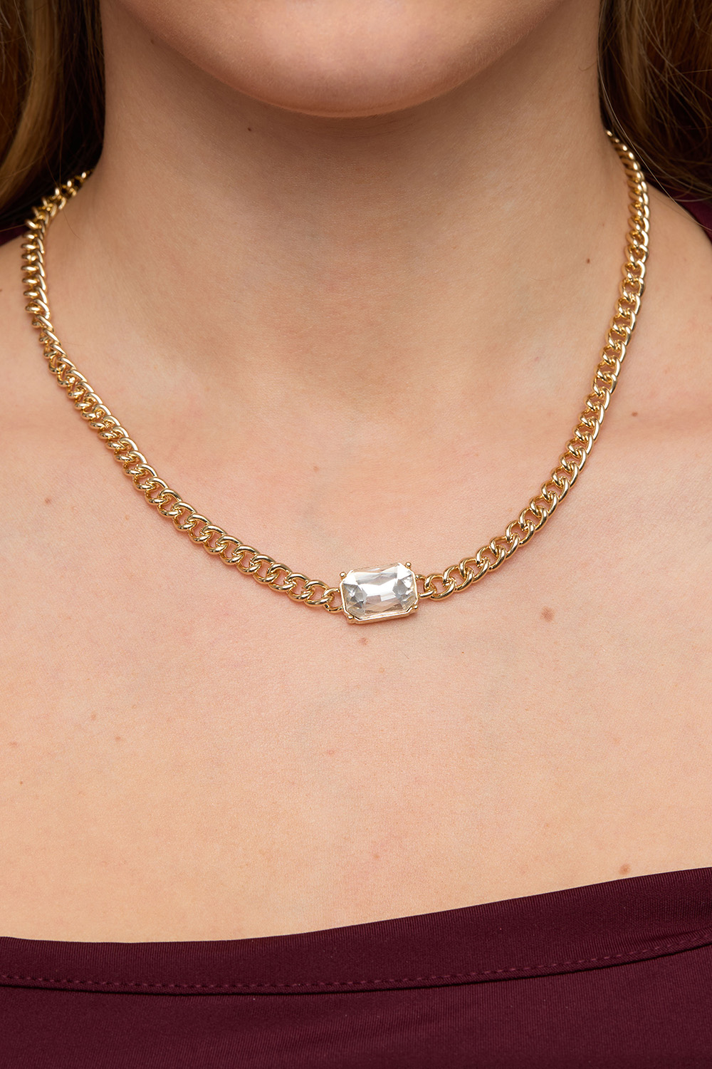 Halsband i guldfärgad metall med grov kedja och en stor rektangulär glassten.