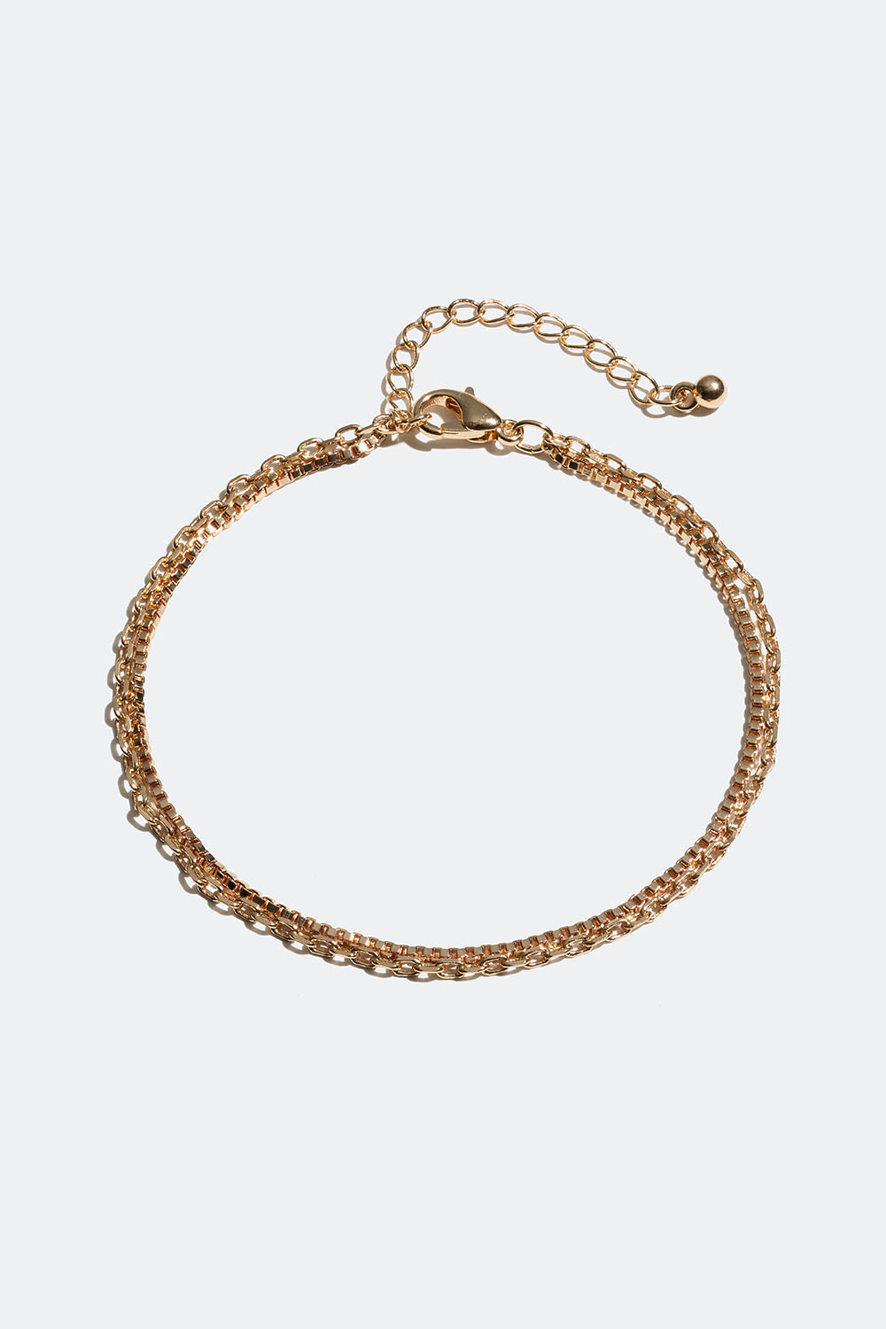 Stilrent armband med dubbla kedjor i guldfärgad metall. Armbandet har en tunn venetiansk kedja och en klassisk ankarkedja. De två länkarna sitter ihop och går inte att använda separat.