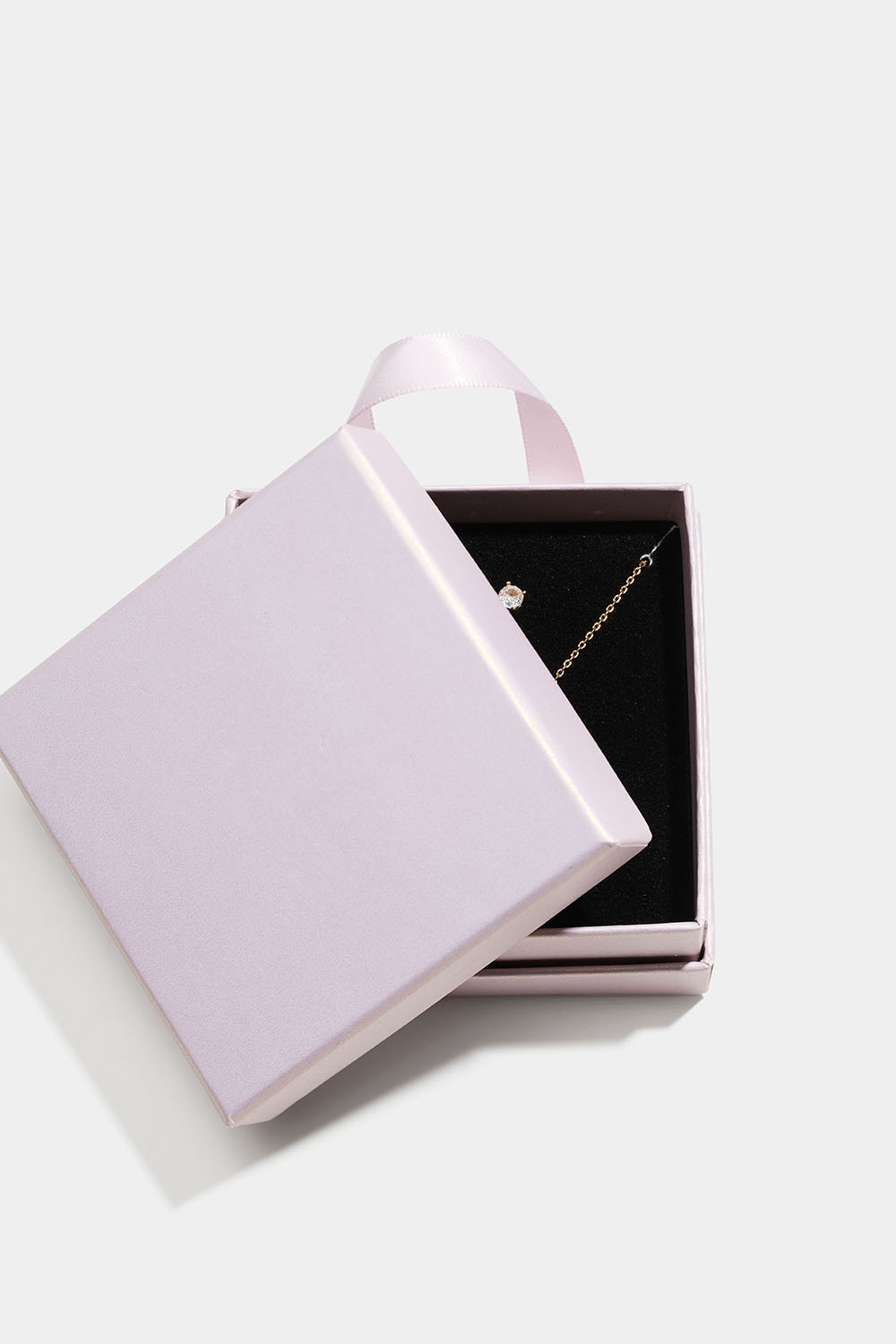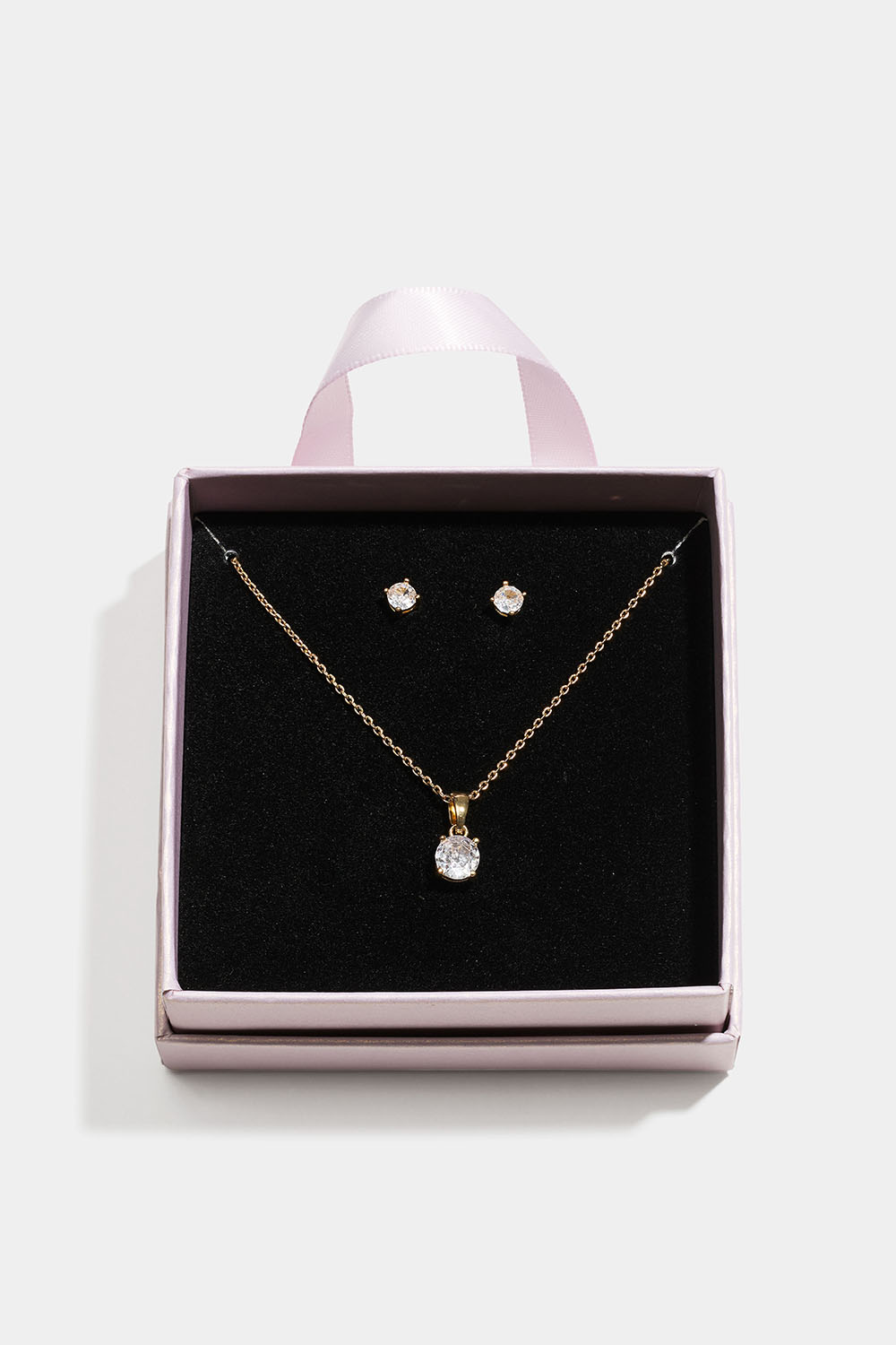 Smyckessetet består av ett par guldfärgade studs med vita glasstenar och ett guldfärgat halsband med vit glassten, fint förpackade i en rosa presentask med dyna i svart velour.
