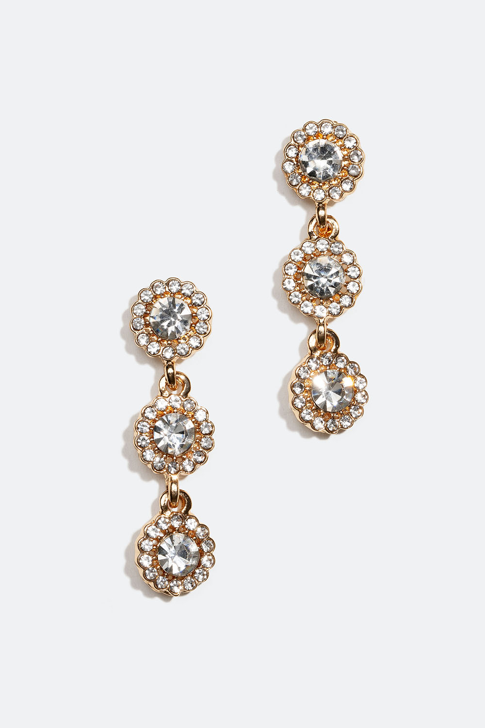 Skimrande örhängen i guldfärgad metall i strass med tre runda glasstenar och små glasstenar runt om.