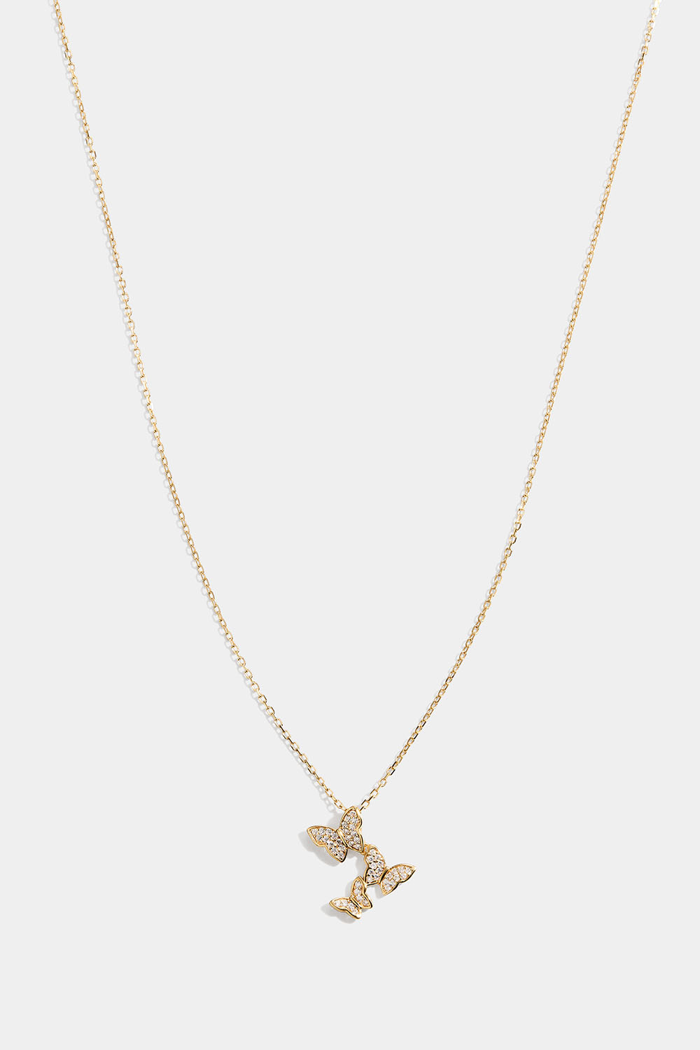 Kedjehalsband i 18k guldpläterat äkta silver med ett hänge av tre fjärilar som är dekorerade med små gnistrande stenar av Cubic Zirconia.