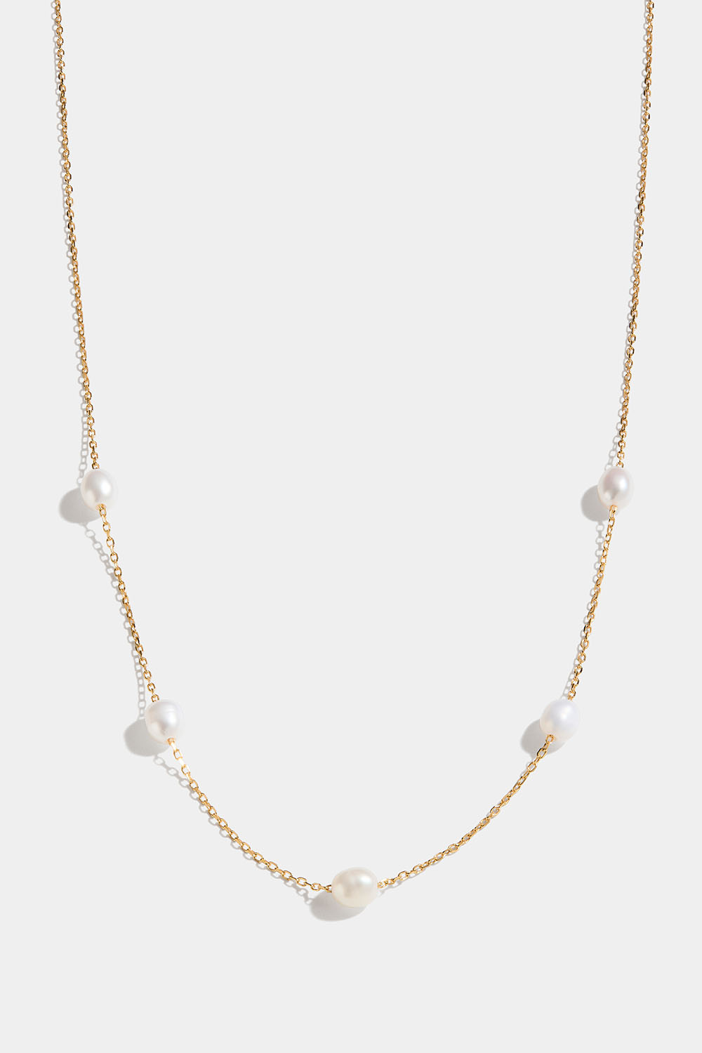 Tunt halsband i 18k guldpläterat äkta silver med fem, ovala sötvattenspärlor.