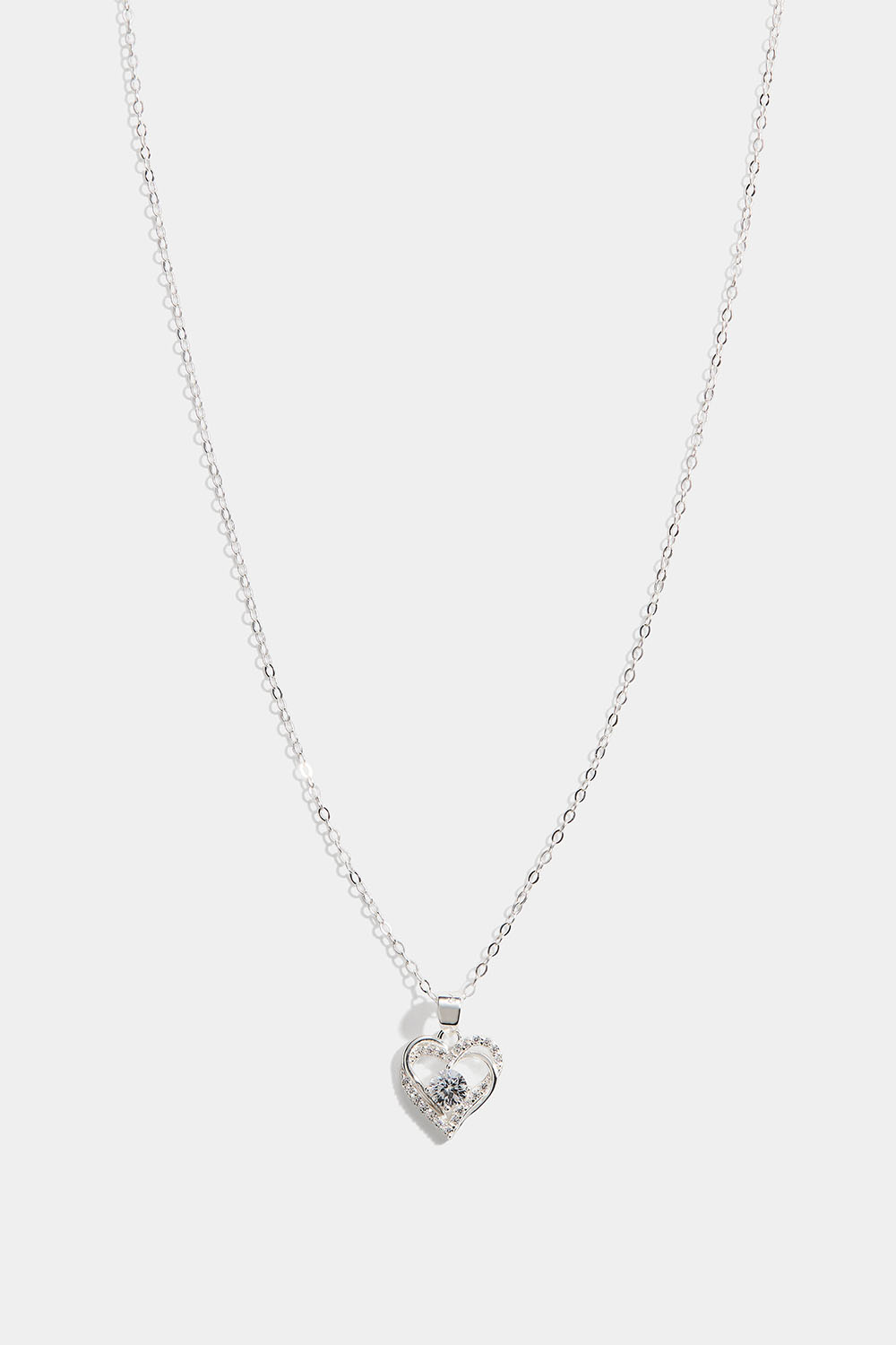 Halsband i äkta silver med hjärtan som är sammansatta, en av dom dekorerad med Cubic Zirconia stenar. I mitten av hjärtanen finns en större sten.