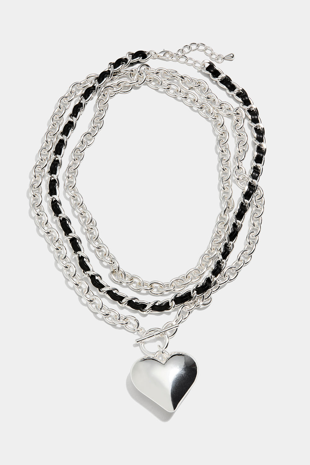 Två halsband i silverfärgad metall med grov kedja. En kortare med invävt fejkläderband, och en längre med stort hjärthänge och T-bar stängning. Den längre kan användas hellång eller dubbelt som på bild.