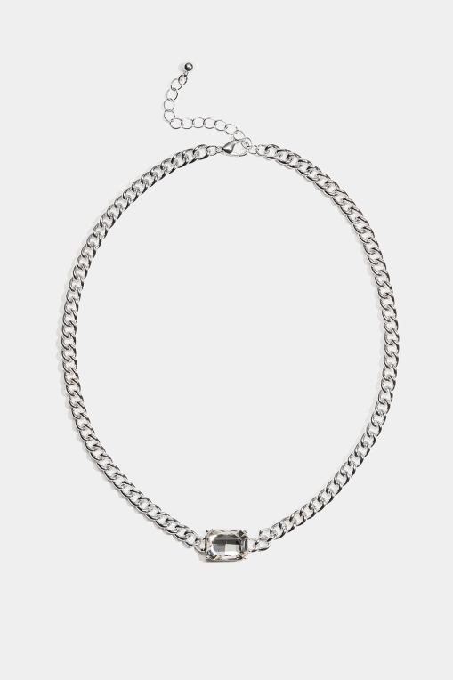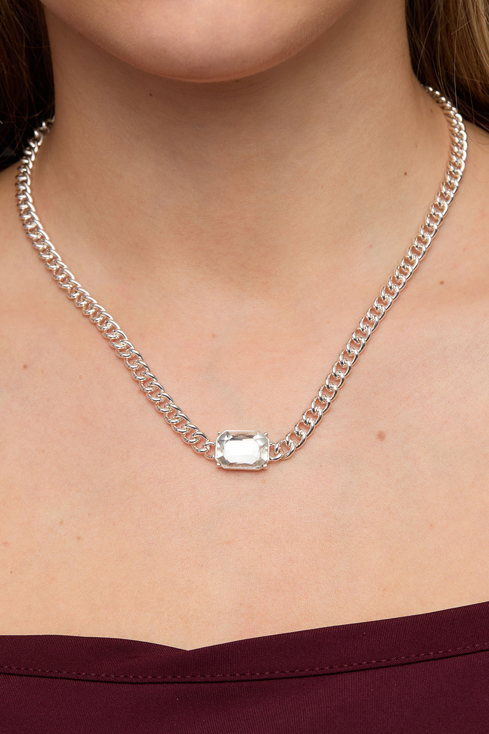 Halsband i silverfärgad metall med grov kedja och en stor rektangulär glassten.