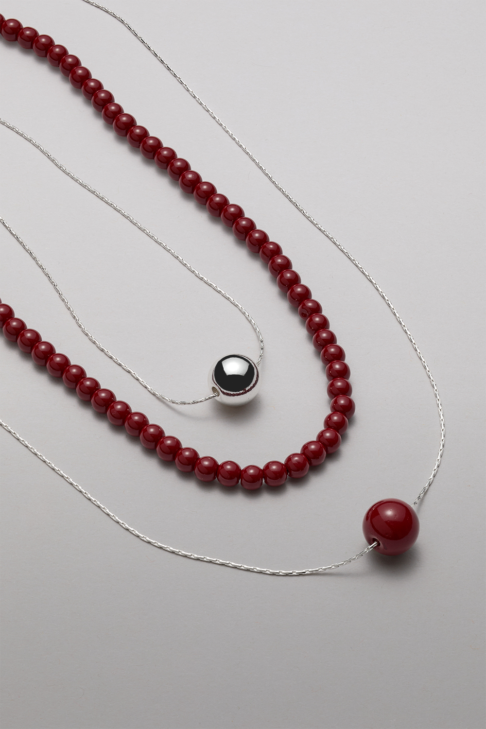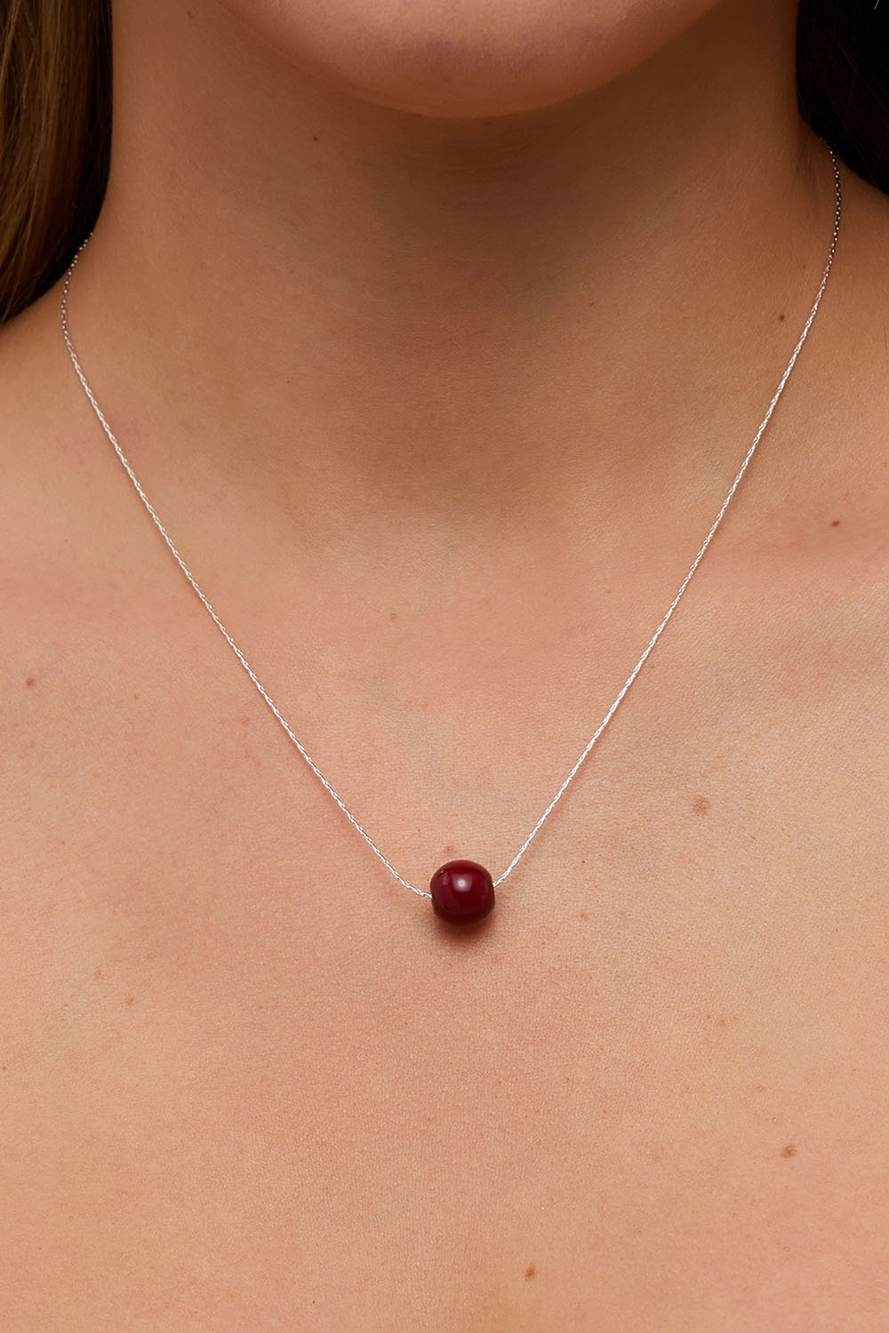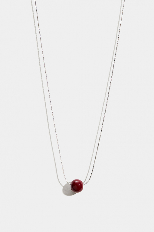 Halsband med rund kompakt silverfärgad kedja med en vinröd kula i glas.
