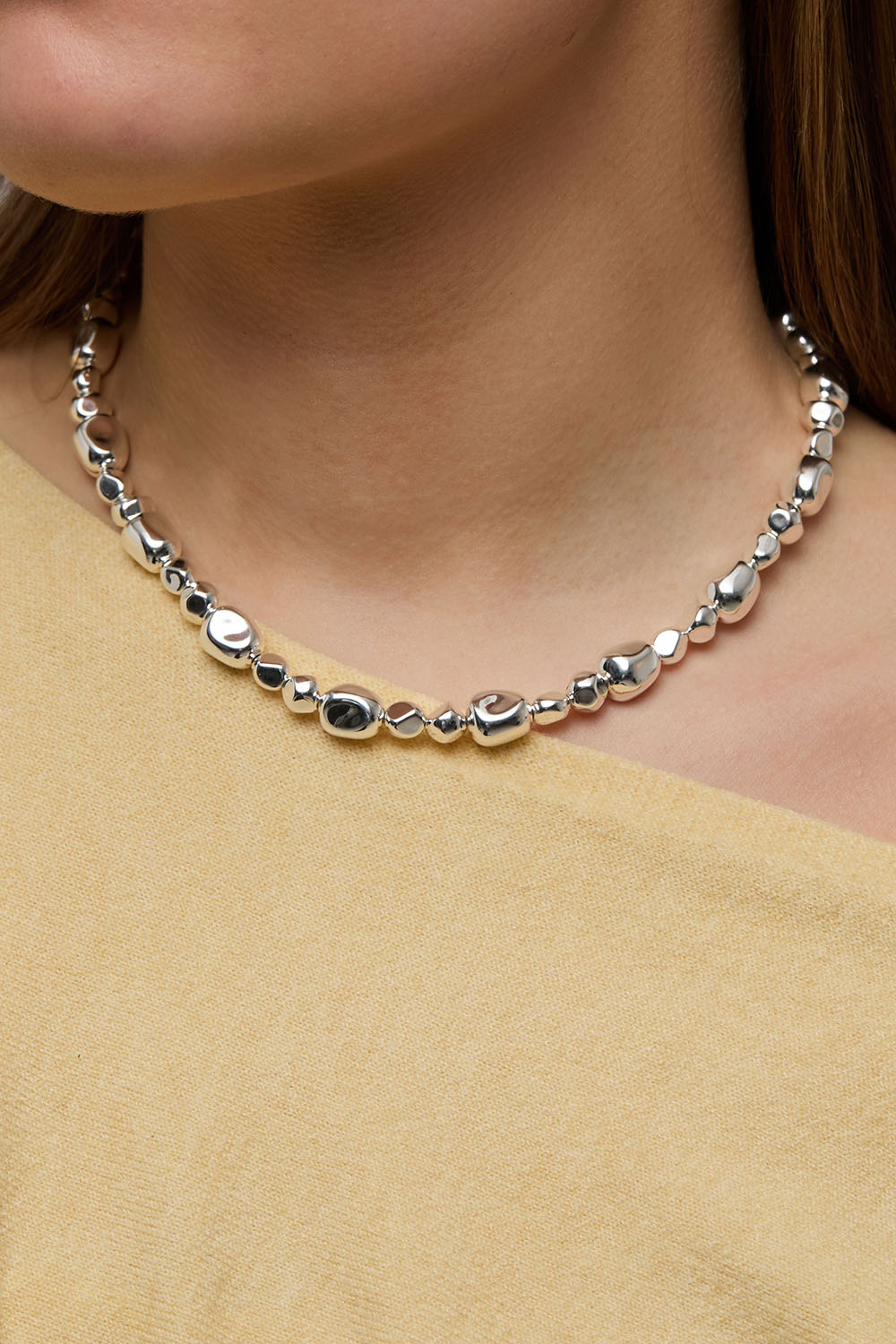 Halsband med silverfärgade pärlor i olika storlek med organisk design.