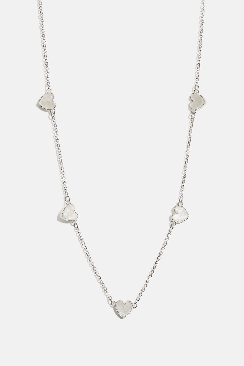 Halsband med tunn kedja dekorerad med vita skimrande hjärtan.