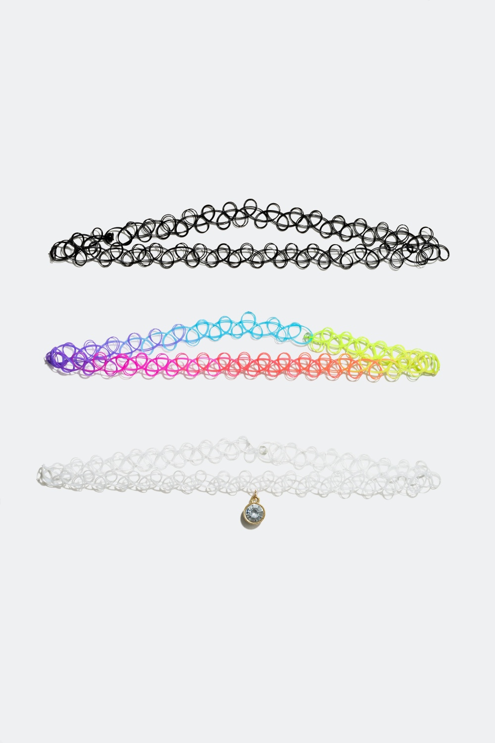 Tre halsdekorationer i flätad plast, ett dekorerat med glassten. Dessa halsband är elastiska.
