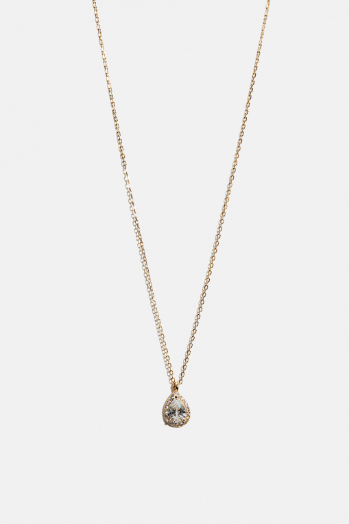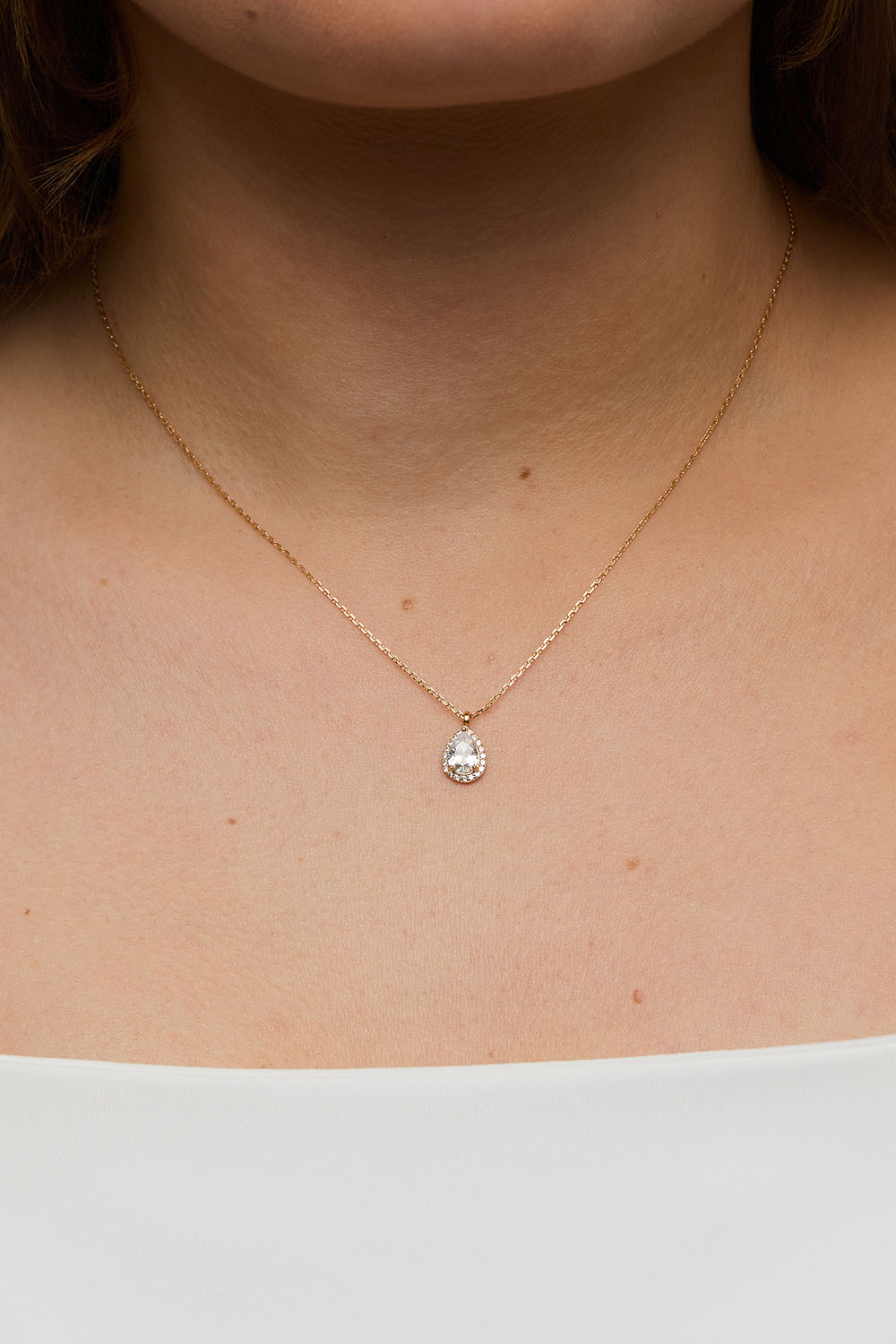 Halskedja i 18k guldpläterat äkta silver med ett hänge av en större droppfomad sten Cubic Zirconia med små stenar runtom.