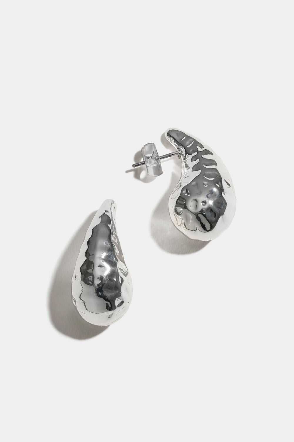 Droppformade örhängen i hamrad, silverfärgad metall.