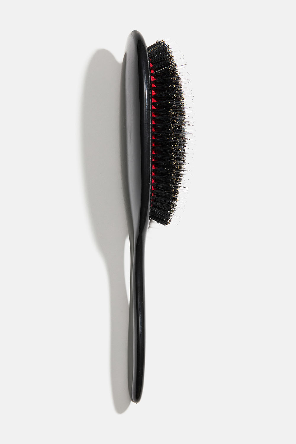 En hårborste gjord av en blandning av äkta svinborst och nylonpiggar med svart handtag. Fungerar för alla hårtyper. Använd inte med värme.