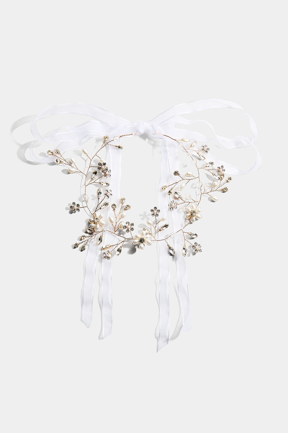 En vacker hårdekoration med tvinnade trådar i guldfärgad metall som dekorerats med blommor i glassten och vita pärlor. En perfekt håraccessoar till fest och bröllop som knyts fint ihop med hjälp av vita band.
