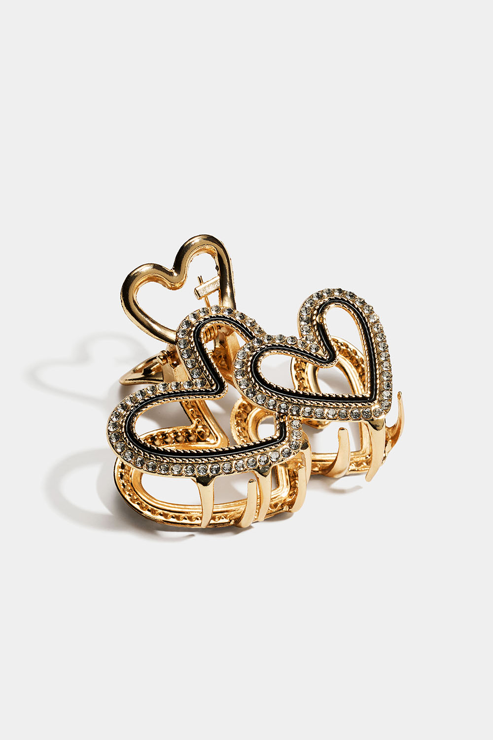 Hårklämma i guldfärgad metall med hjärtan dekorerade med svarta detaljer och små vita glasstenar.